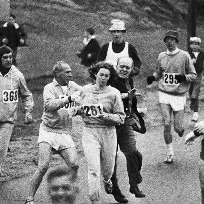 Imagen recuperada de: Pinterest/ Fotografía de Kathrine Switzer primera mujer en correr dentro de un maratón exclusivo para hombres, en Boston, 1967.
