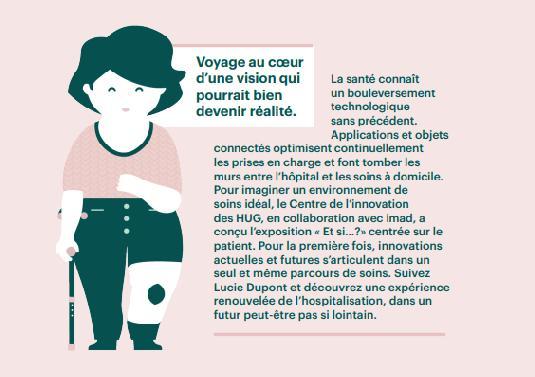 En octobre 2018, le Centre de l’innovation, en collaboration avec l’imad, participe au salon Planète Santé et y présente l’exposition “Et si…?”. Celle-ci propose un environnement de soin idéal centré sur le patient ou la patiente, où applications et objets connectés font tomber les murs entre l’hôpital et les soins à domicile. Au travers de Lucie Dupont, patiente fictive, visiteurs et visiteuses peuvent découvrir une expérience nouvelle de l’hospitalisation, dans un futur peut-être pas si lointain.