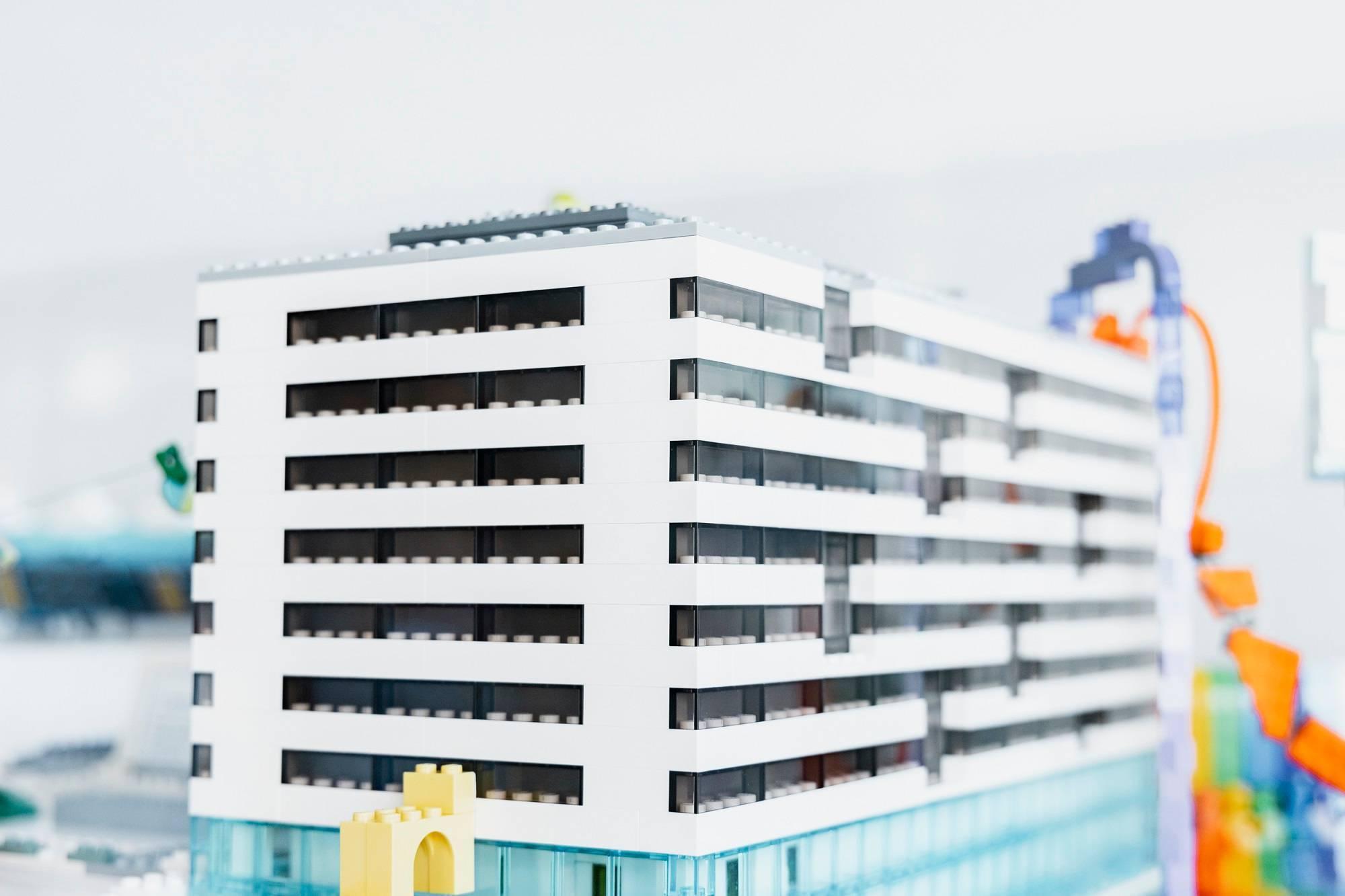 L’esplanade est aménagée avec des LEGO en bois géants.