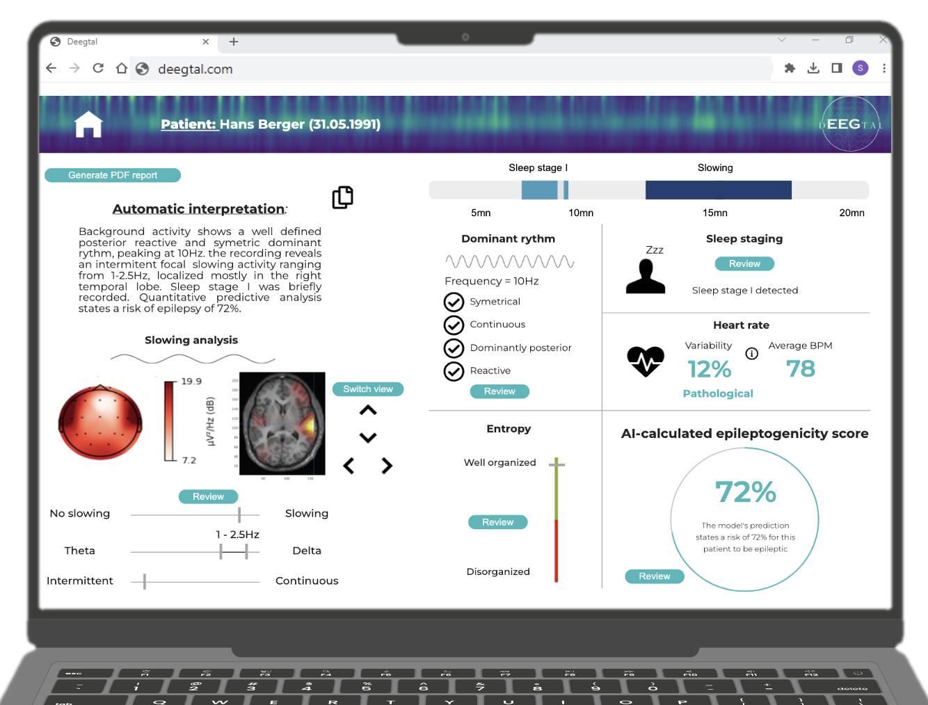 dEEGtal, contrairement aux solutions présentes sur le marché, fournit un score de risque d’épilepsie, facilite l’interprétation en proposant une interprétation automatisée des périodes de ralentissement visibles sur le signal et génère des rapports automatiques, tout en résumant les informations essentielles à l’interprétation de l’EEG dEEGtal, agit ainsi comme un copilote, assistant le neurologue dans sa lecture du tracé L’interface intuitive et personnalisable permet une intégration fluide dans le travail des cliniciens au quotidien, tout en offrant des outils avancés pour comparer les EEG dans le temps et suivre l’évolution des patients.