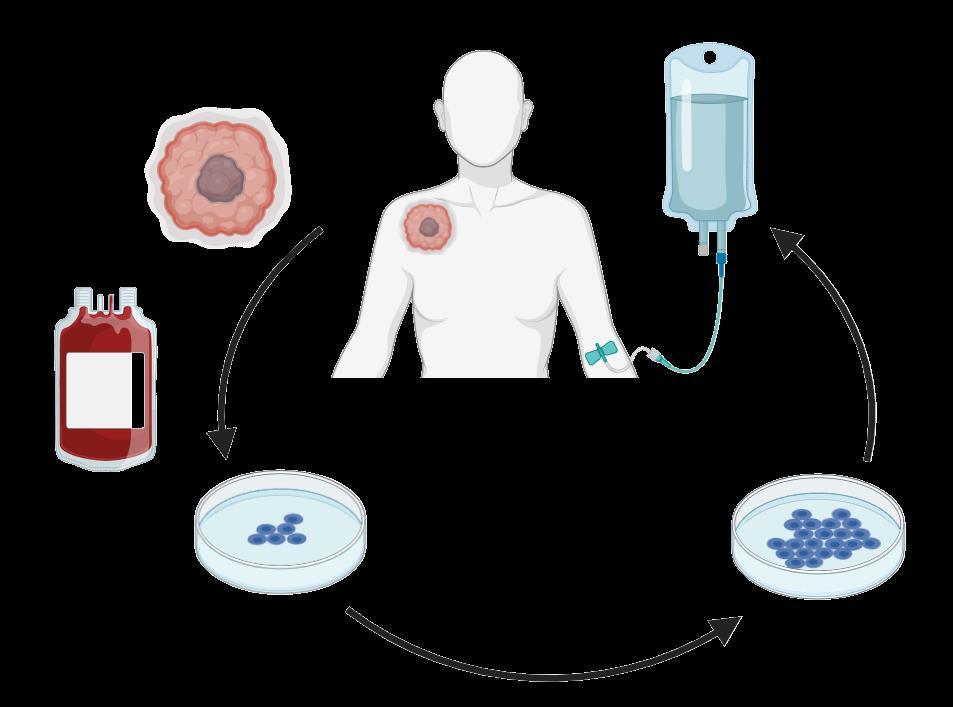 Pour produire des thérapies cellulaires, les cellules immunitaires sont prélevées de la tumeur ou du sang, puis elles sont amplifiées Plusieurs stratégies renforcent leur activité anticancéreuse, comme des modifications génétiques (OGM) ou l'ajout de différents produits biologiques activateurs Néanmoins, ces procédés peuvent être complexes (durent des mois) et restent assez coûteux ($500K - 1 million/patient)