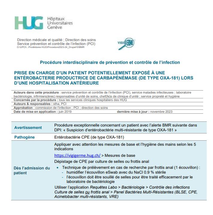 Service prévention et contrôle des infections, Hôpitaux Universitaires de Genève (SPCI HUG).