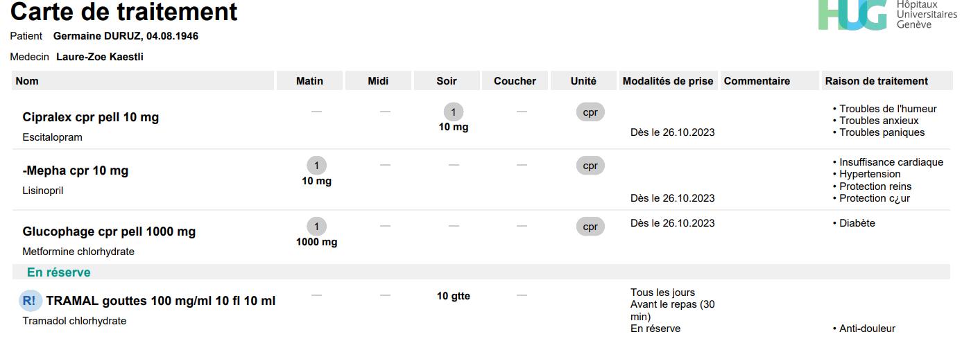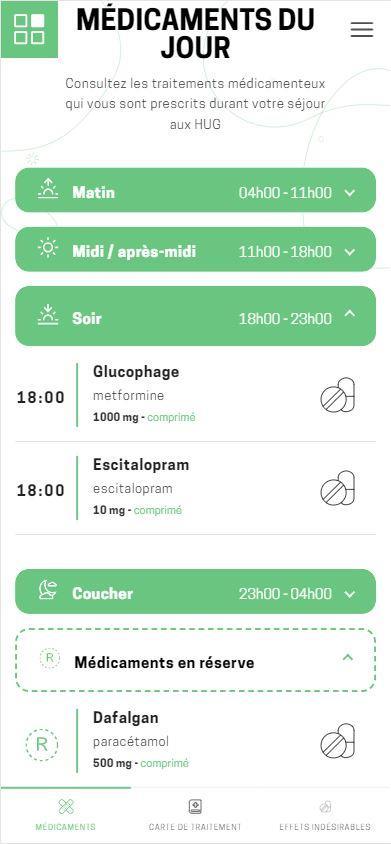• Affichage en temps réel des médicaments prescrits (Presco) et administrés (Echéancier) aux HUG