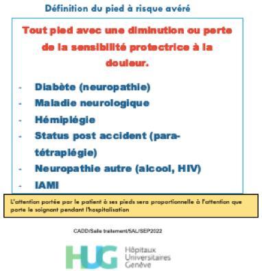 Promouvoir une prise en soins standardisée sur le «Pied à Risque Avéré» au sein des HUG. Développer le travail en réseaux avec les équipes en aval et les médecins traitants.