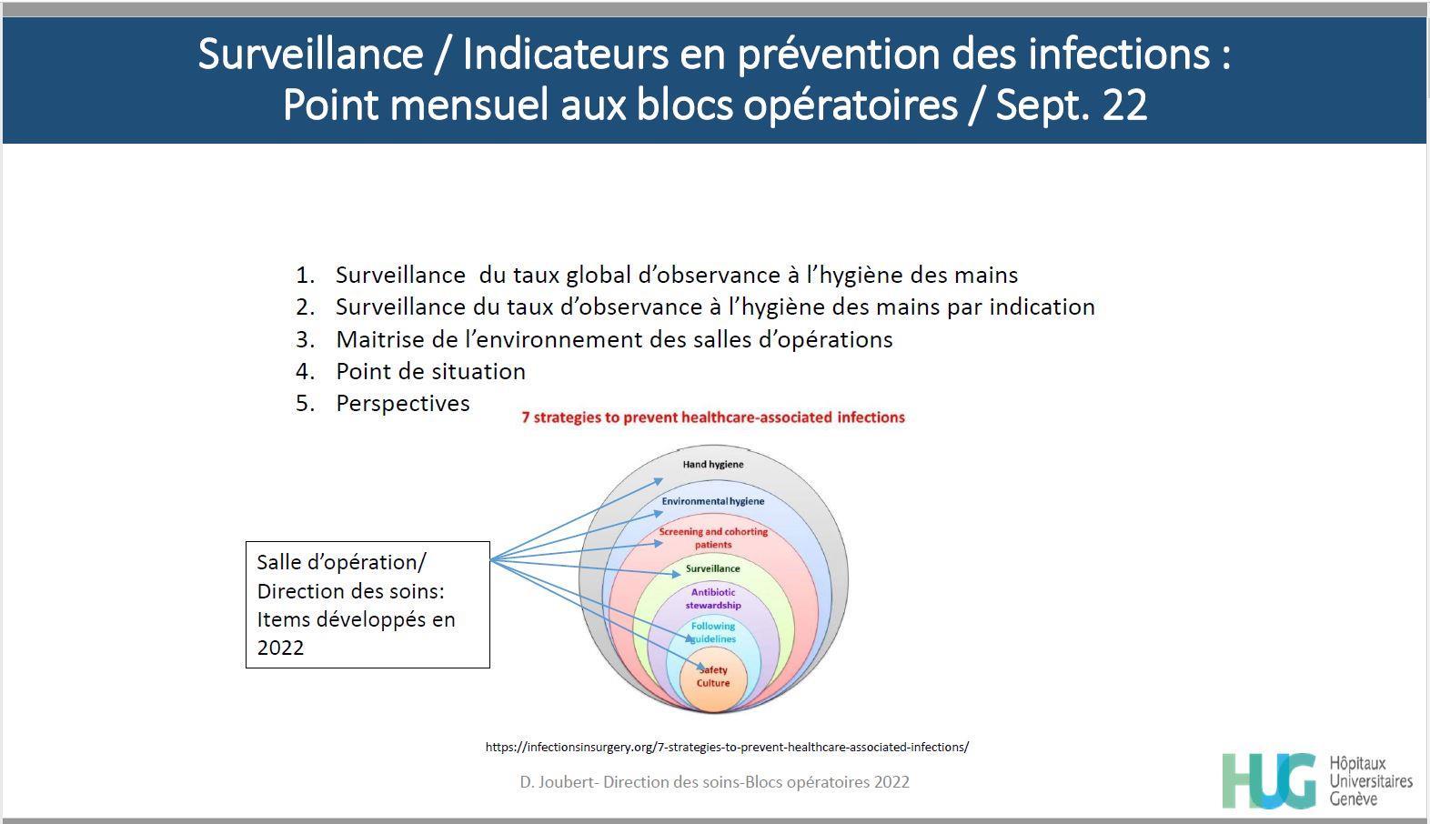 Mesurer de façon continue et dynamique certains indicateurs significatifs reflétant la qualité de la prise en charge du risque infectieux au bloc opératoire afin de rendre leur amélioration pérenne et visible.