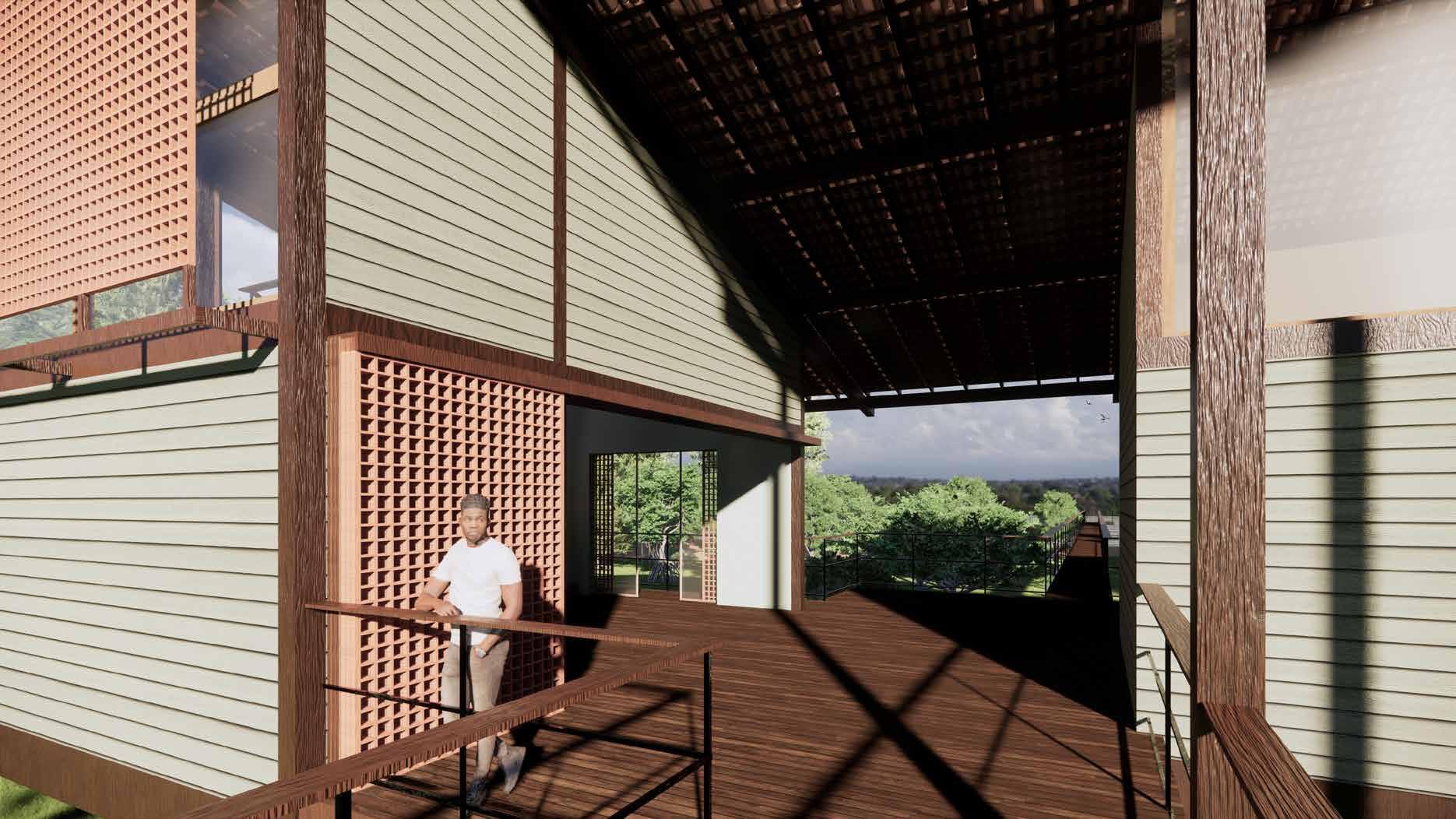 Baseado nas análises das residências locais, foi percebido um padrão na forma de construção das coberturas e varandas. A granda maioria das casas possuem uma determinada extensão em uma das águas do telhado, formando assim grandes beiras sobre as residências que consequentemente contribuem para formação de varandas. Para esse projeto, buscou-se as mesmas lógicas.