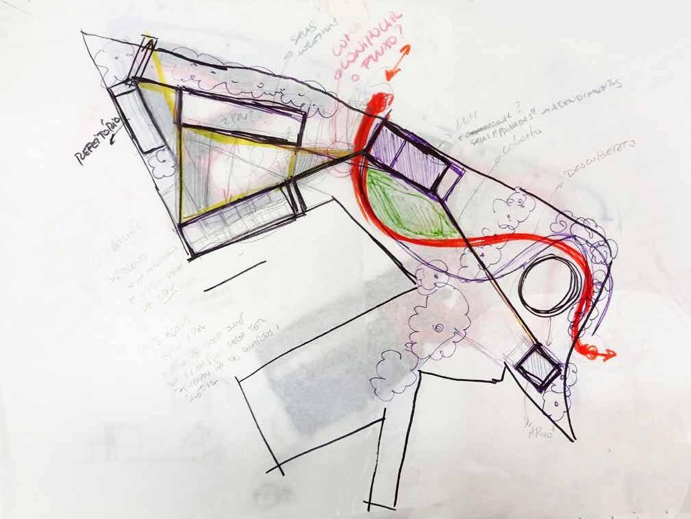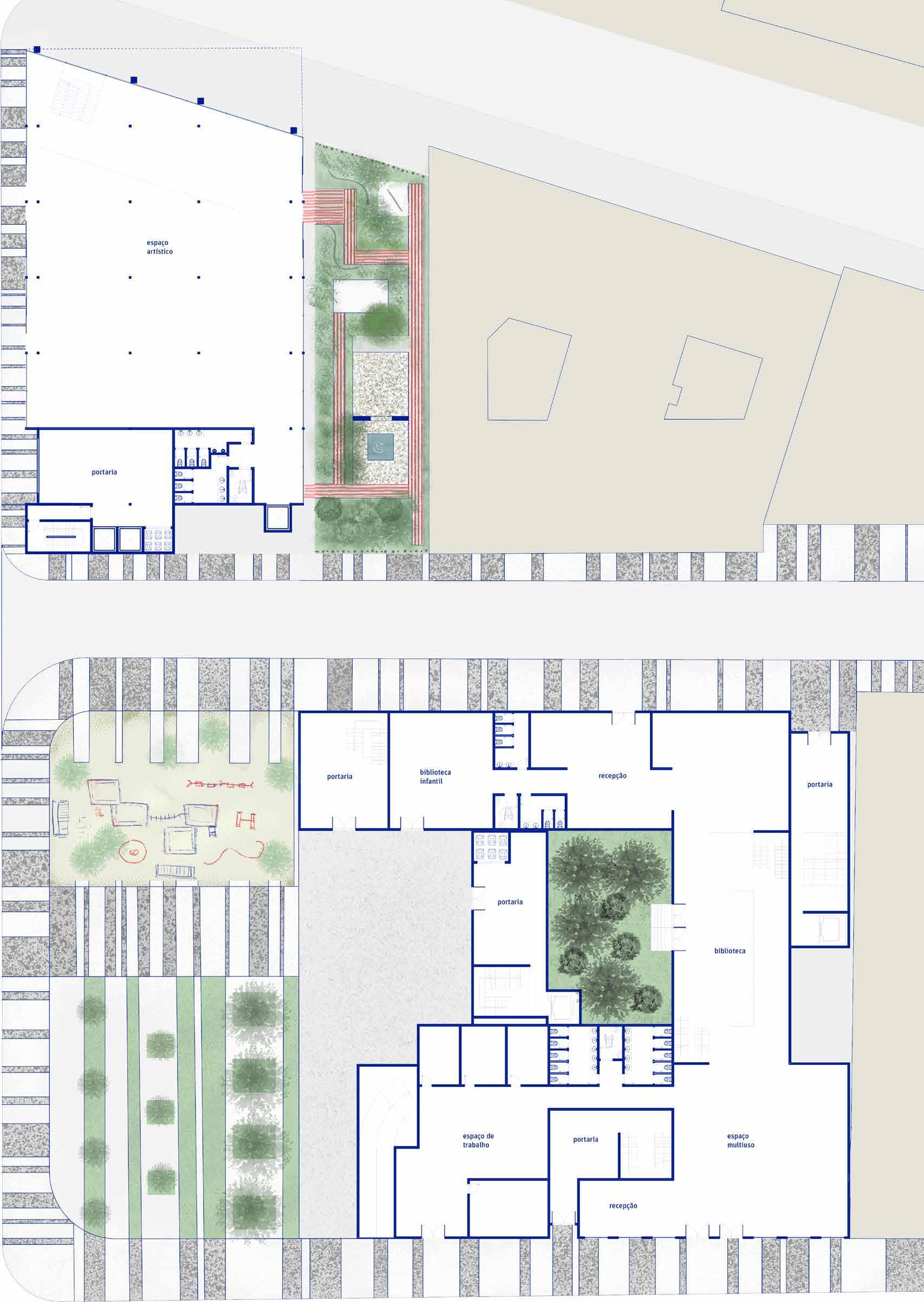 Ao sermos apresentados a dois terrenos distintos, com legislações diferentes, em quadras diferentes, porém adjacentes decidimos explorar estratégias projetuais diferentes para cada terreno, respondendo às suas especificidades. Assim, um possui um eixo temporal verticalizado e o outro relaciona-se diretamente com a topografia do morro da Conceição. Apesar de suas individualidades, ambos os térreos dialogam pela característica em comum: a permeabilidade, que convida e que costura as diversas camadas históricas existentes.