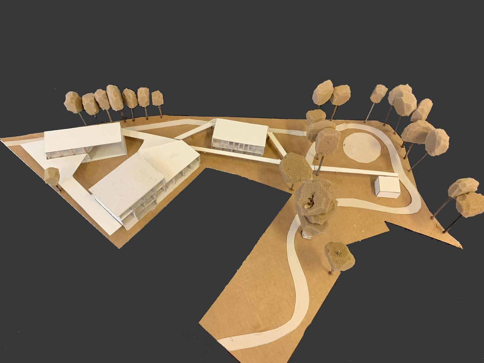 O terreno escolhido para a escola possui alguns desníveis, o que serviu de partido para algumas estratégias projetuais, por exemplo, usou-se das curvas de níveis para a implantação de uma concha acústica.