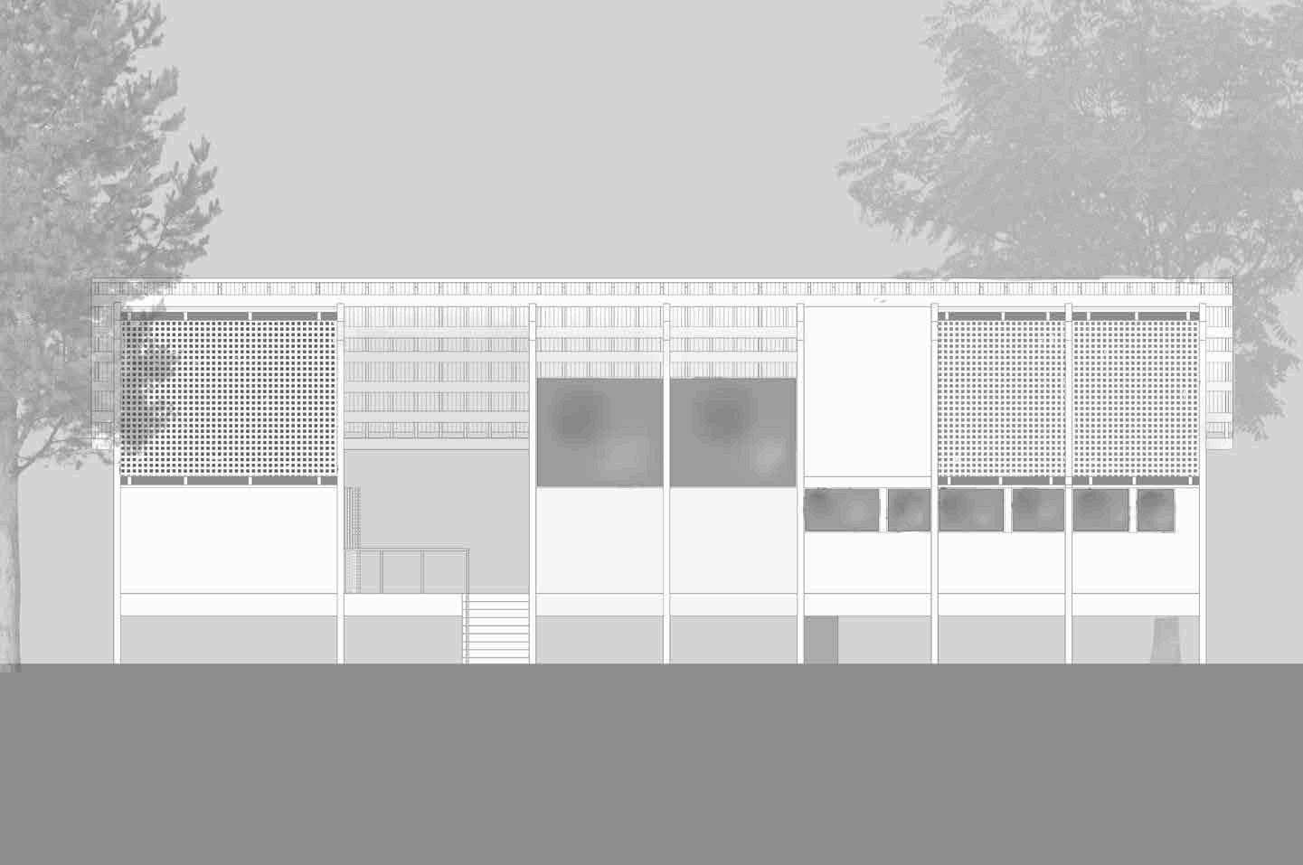 Os diversos módulos de apartamentos em níveis distintos começam a re-topografar a paisagem, de modo a ser mais sólido próximo a empena e a desfazer-se em direção a grande praça que ocupa a frente da edificação.