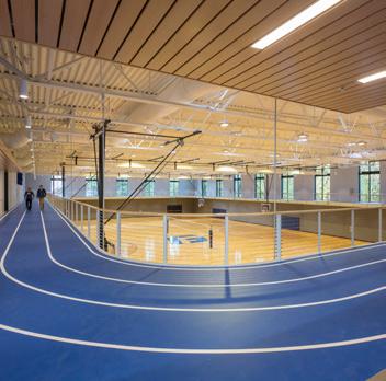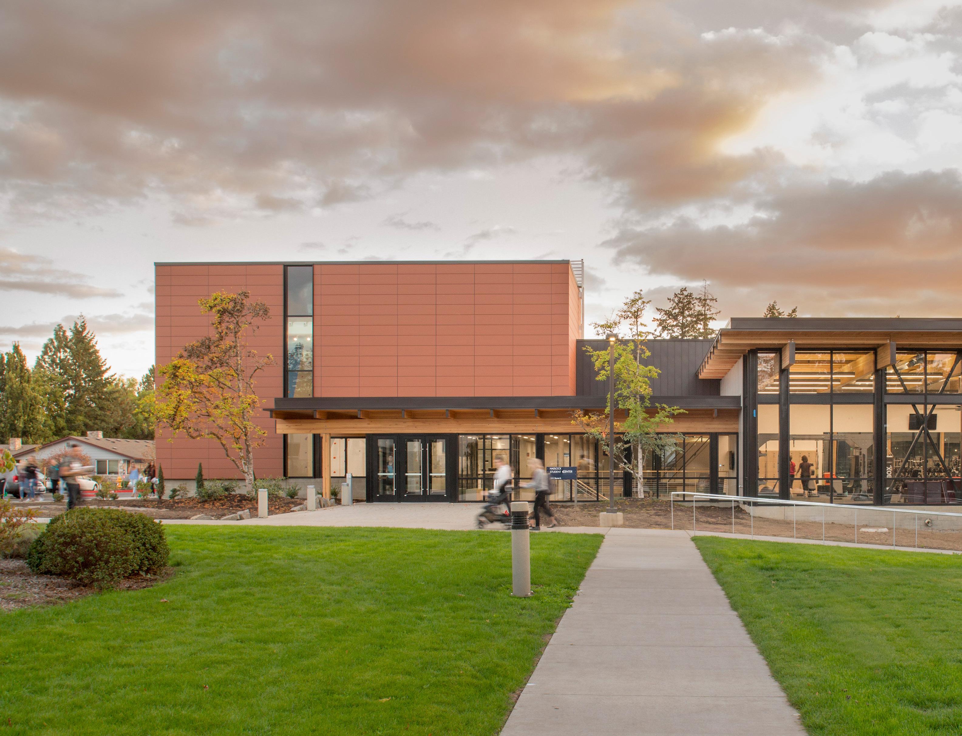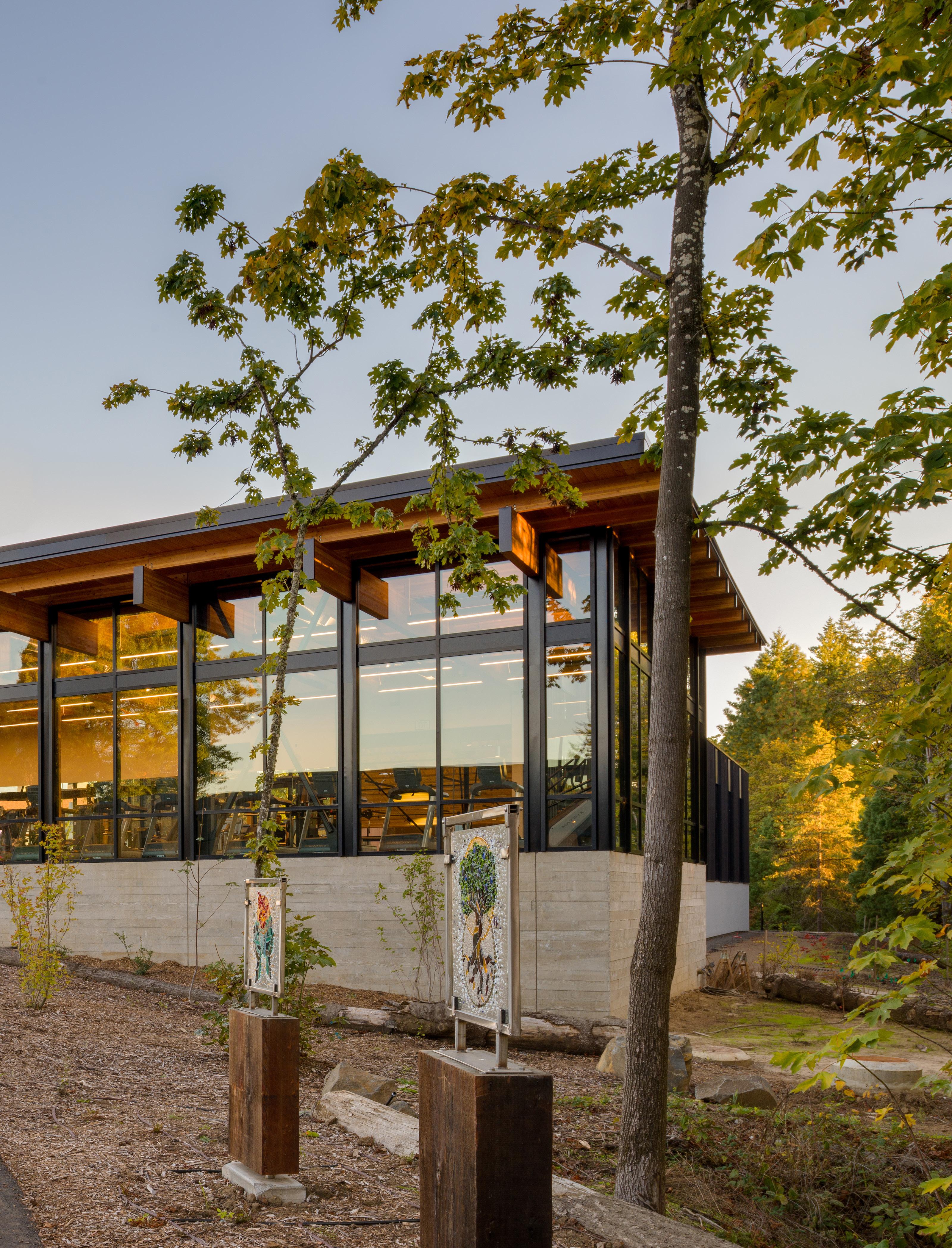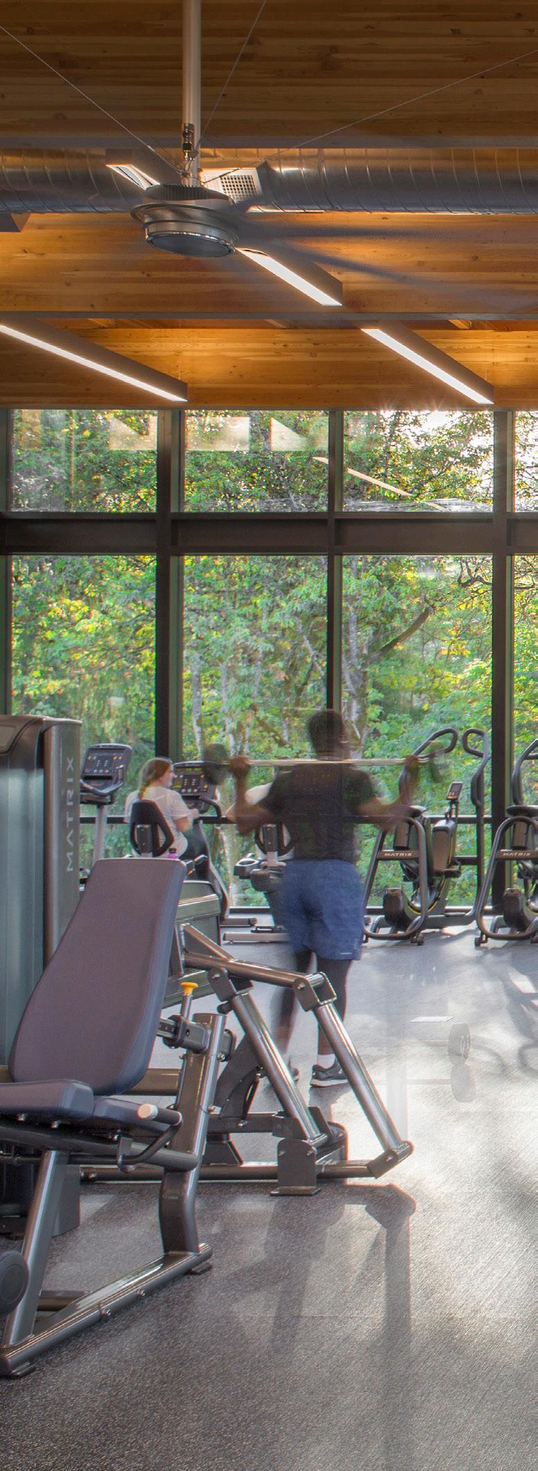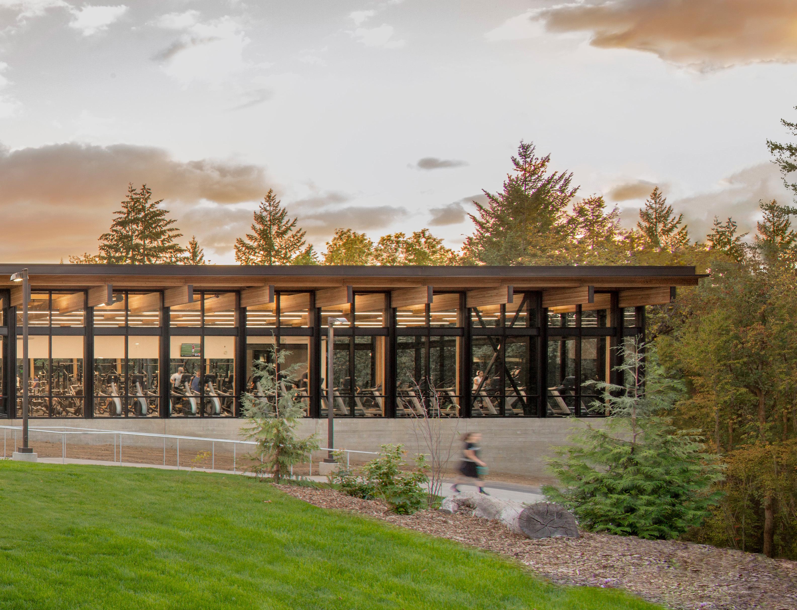 Description: This two-story recreation center for George Fox University houses three basketball/ volleyball courts, a running track, a fitness center, student office space and more. The student center alleviated demands on the school’s prexisting athletic facility, Wheeler Sports Center, providing space for intramural athletics as well as other large events like dances. The fitness center pavilion overlooks Hess Creek, providing soothing views into the forest. Other features include a rock climbing wall, two movement studios, a student lounge and 5,400 feet of office space for student government and clubs.
