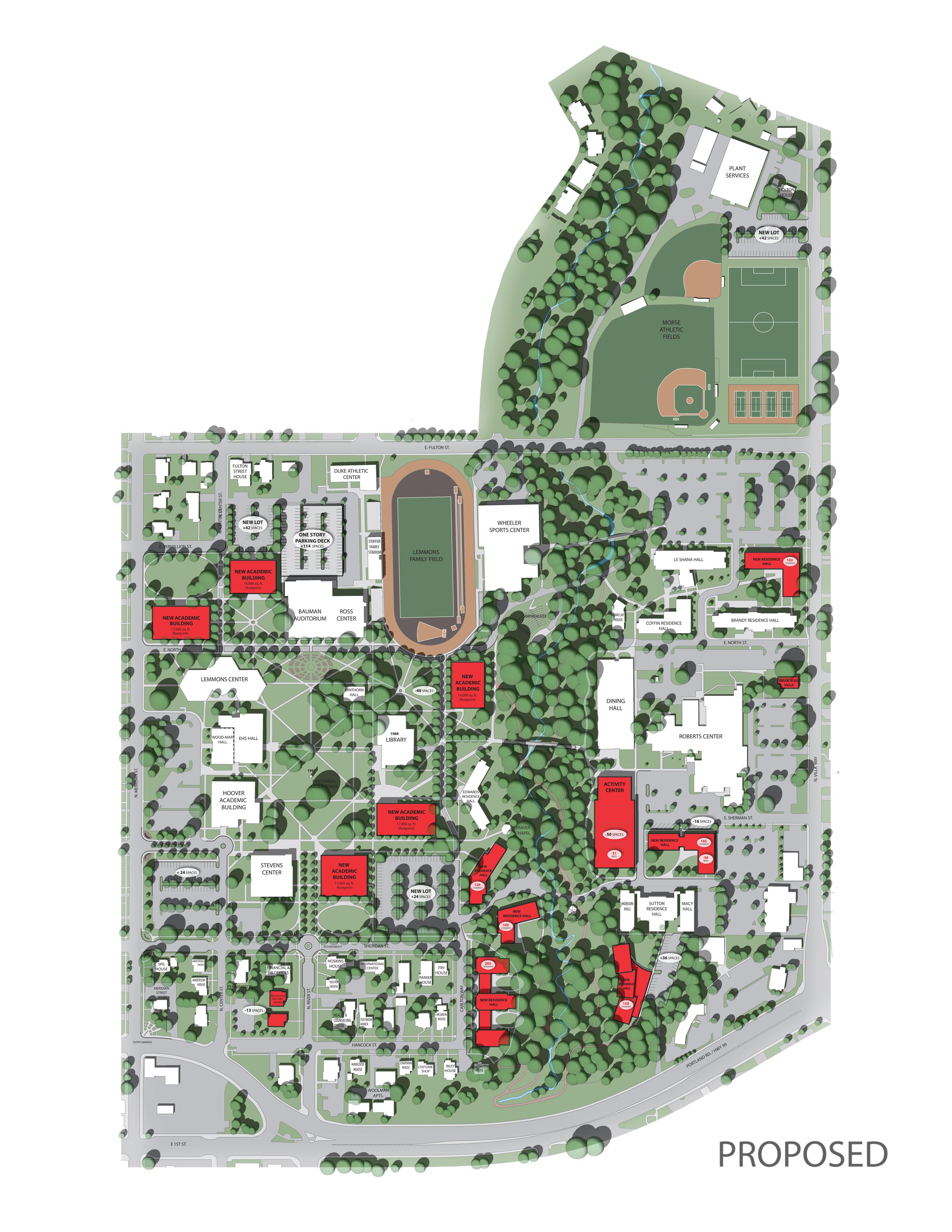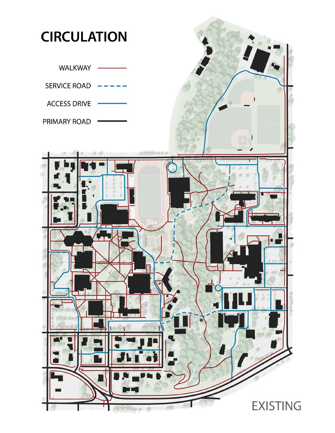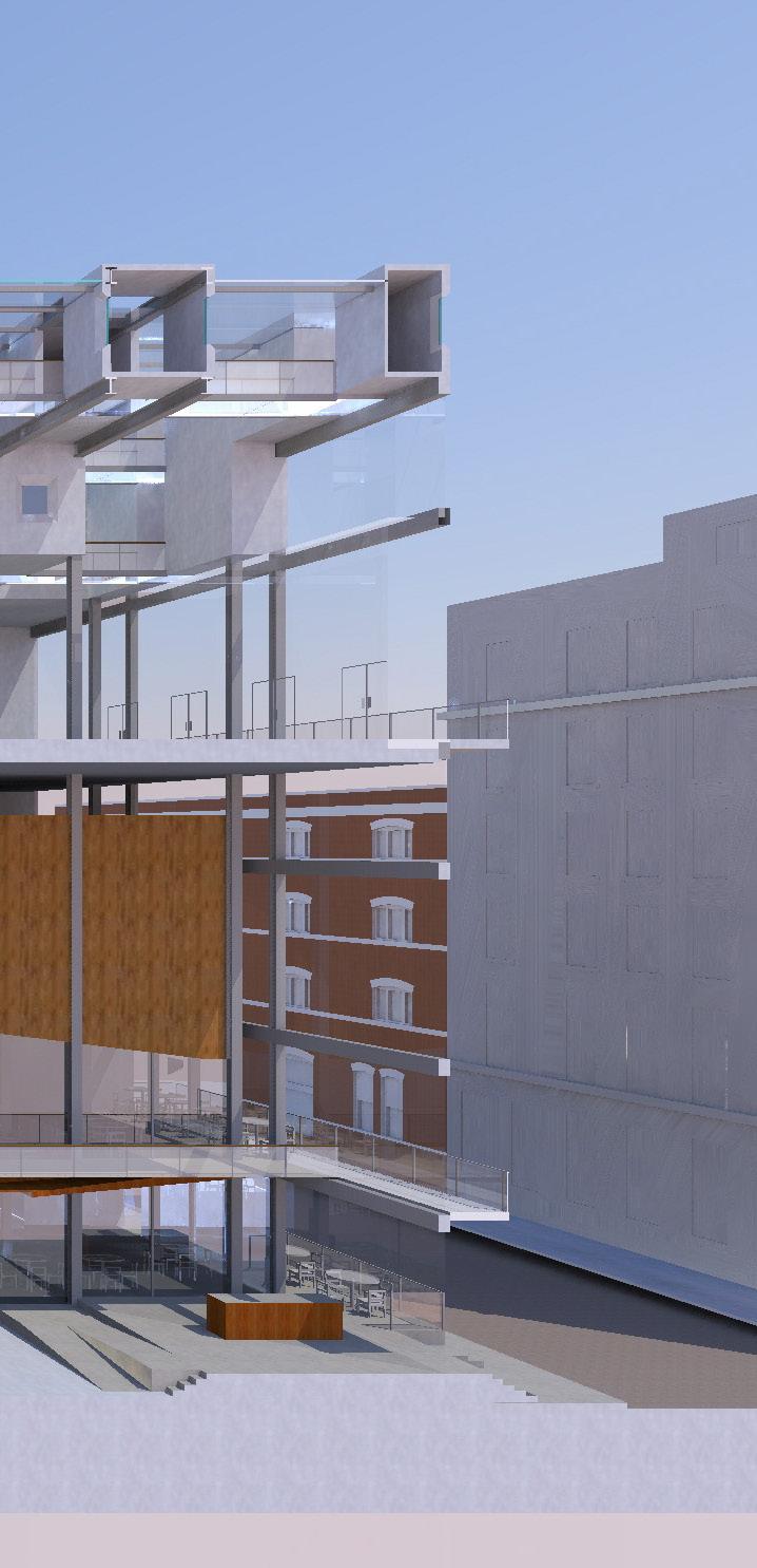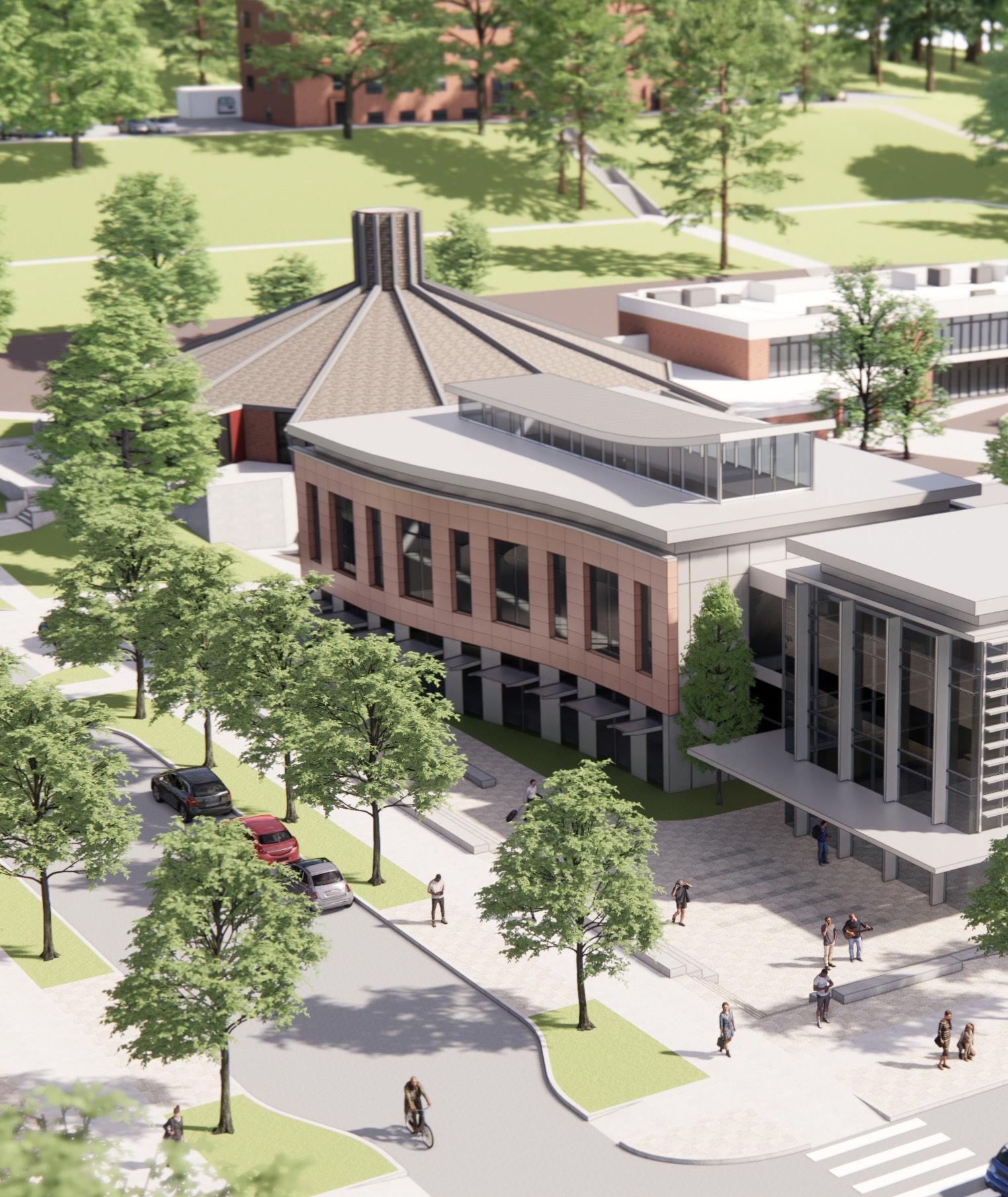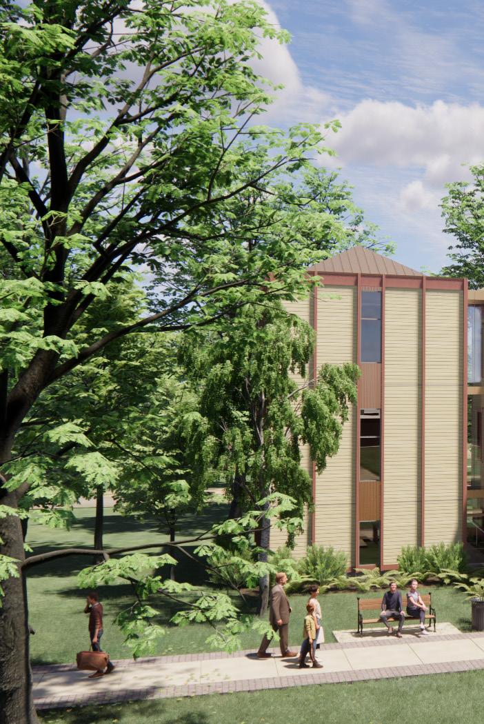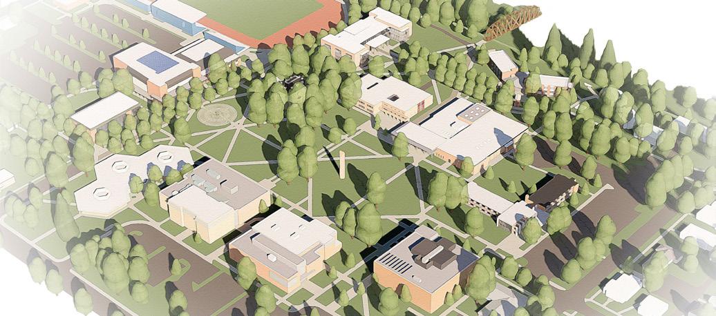 Description: We were tasked with envisioning strategic growth opportunities for the campus, identifying key areas for expansion. The plan focused on enhancing public spaces and improving walkability by strengthening circulation routes and integrating new academic quadrangles to create a cohesive campus experience. Parking was relocated to the periphery, allowing for more pedestrianfriendly zones and open spaces.