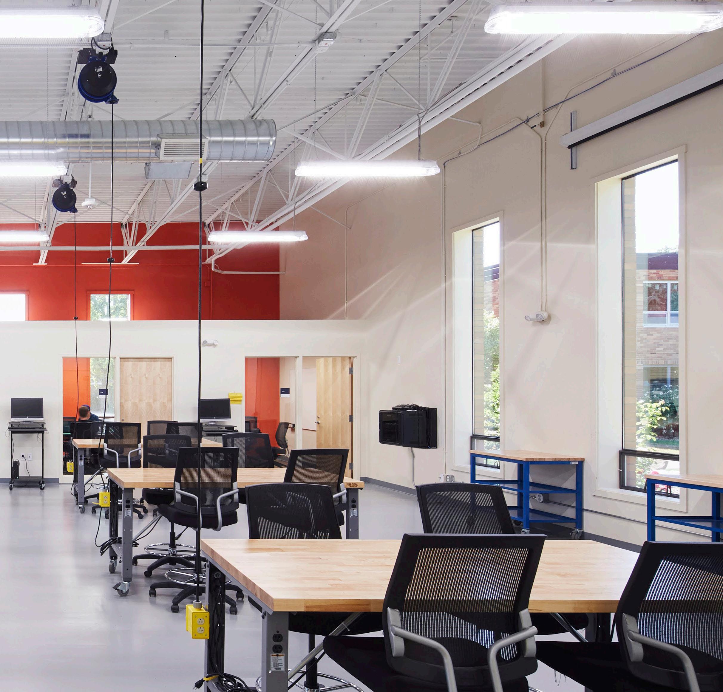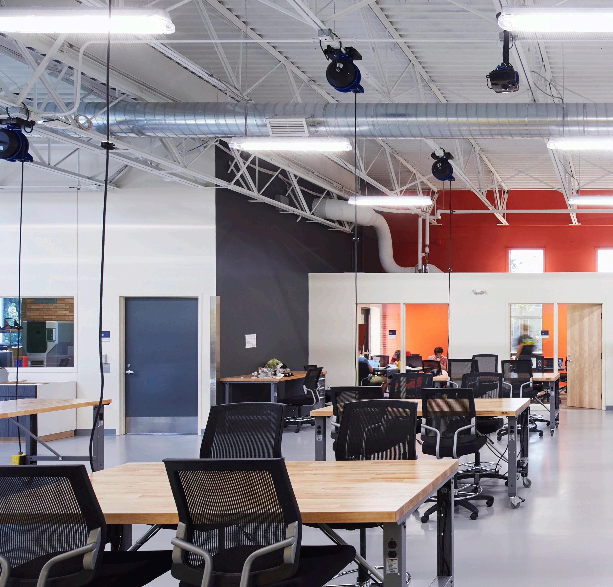Description: An adaptive remodel of the former cafeteria in the Klages Center building, which was built in 1958. The new engineering center is a maker space which connects multiple departments and provides a platform for modern learning and collaboration. In addition to systems upgrades, the project added a machine and woodworking shop, manufacturing and prototyping lab, design rooms, study rooms, an environmental lab, and a tool room. The open main room, or “Collaboratory,” is a large design center where students from engineering and other majors can participate in and showcase design projects.