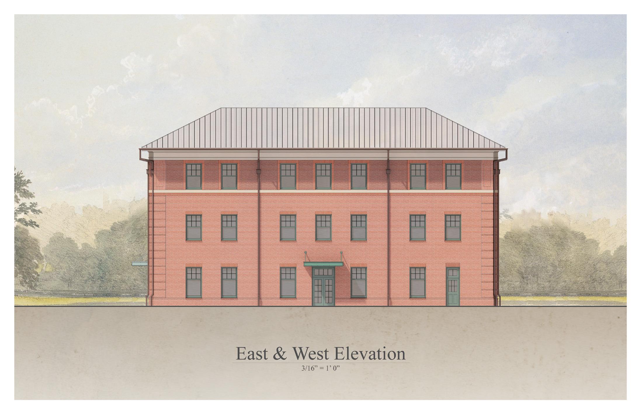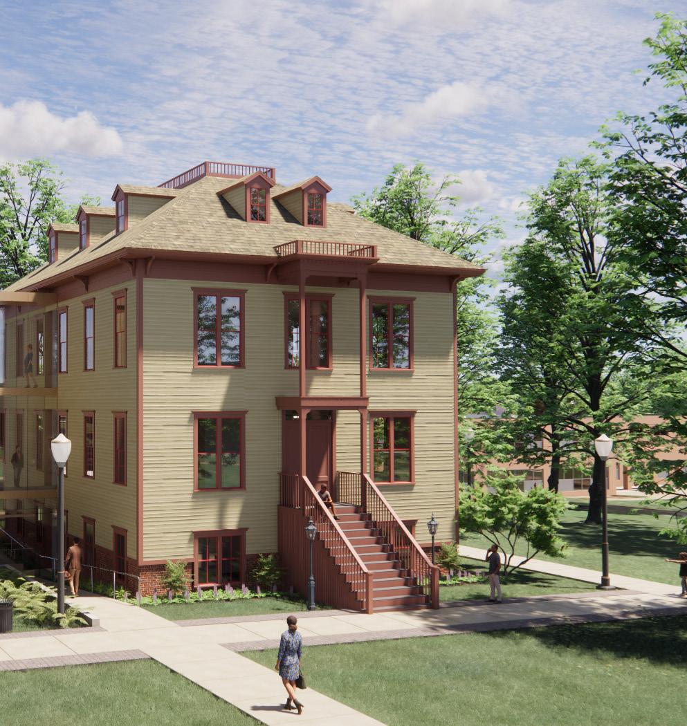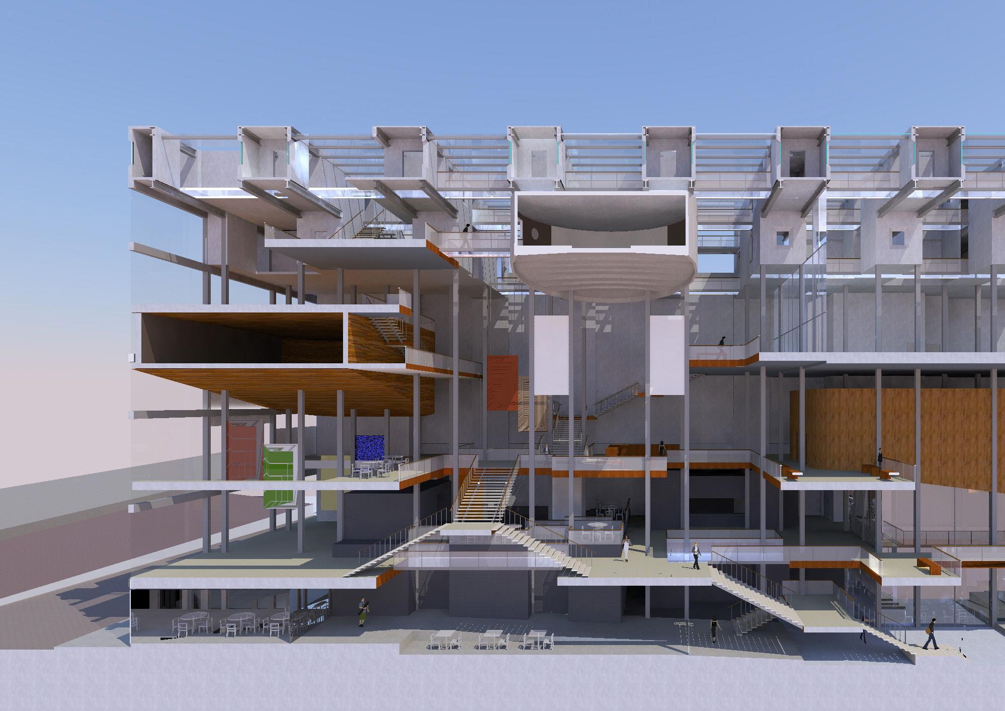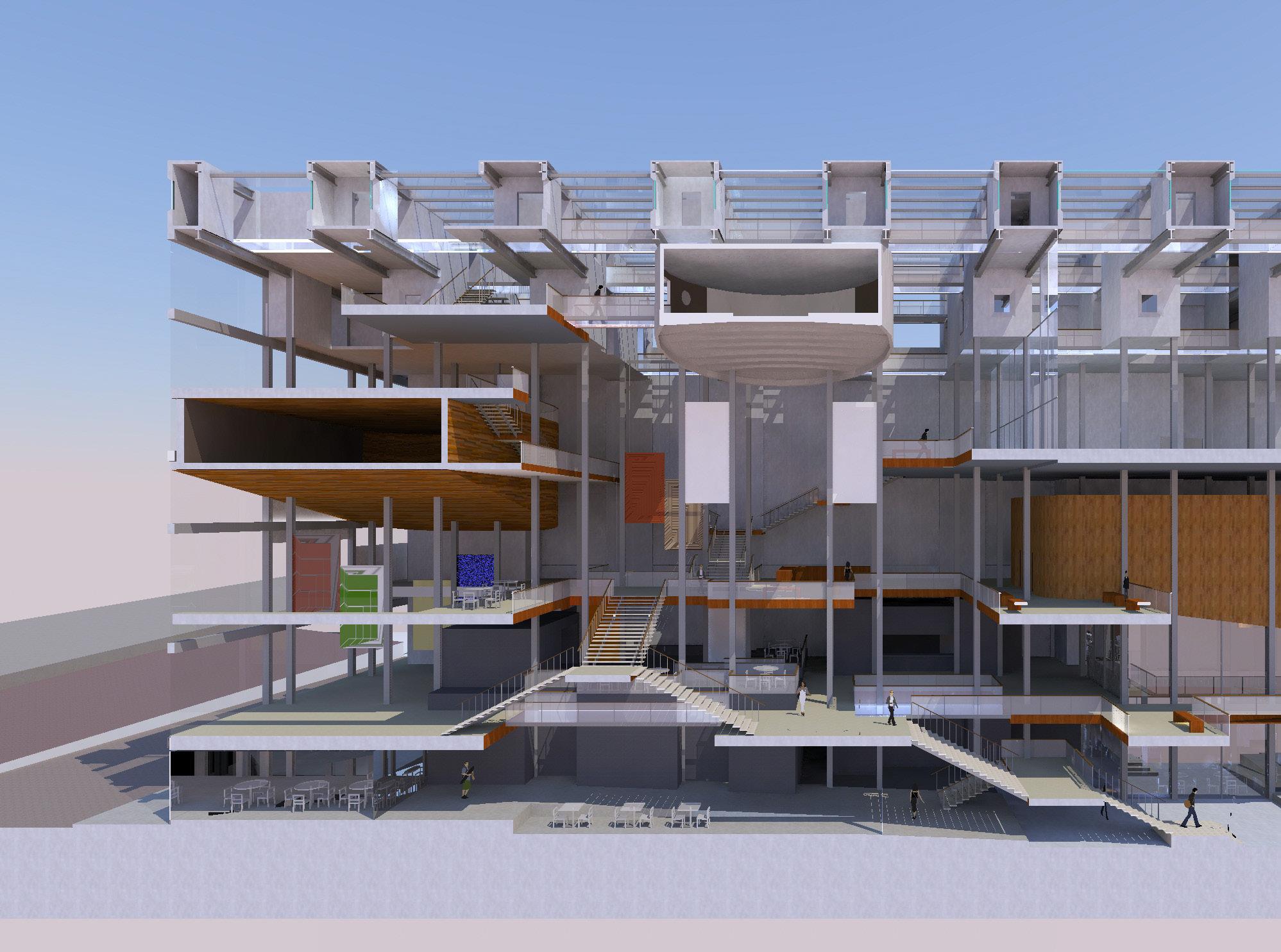 Description: This proposal for a new Arts & Media Building was designed to give students access to greatly improved studio spaces with access to the nearby Engineering Innovation Center. It also facilitaed the relocation and restoration of Minthron Hall, the oldest building on campus, through removal of the old art building, which in turn freed up space to reimagine the main quadrangle as an ellipse. The goal was to create a warm and inviting space with ample access to daylight.