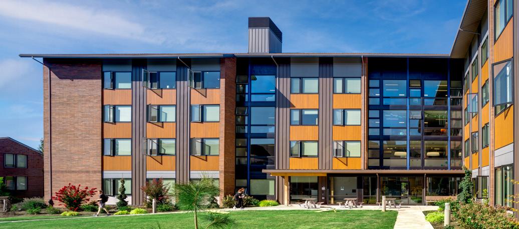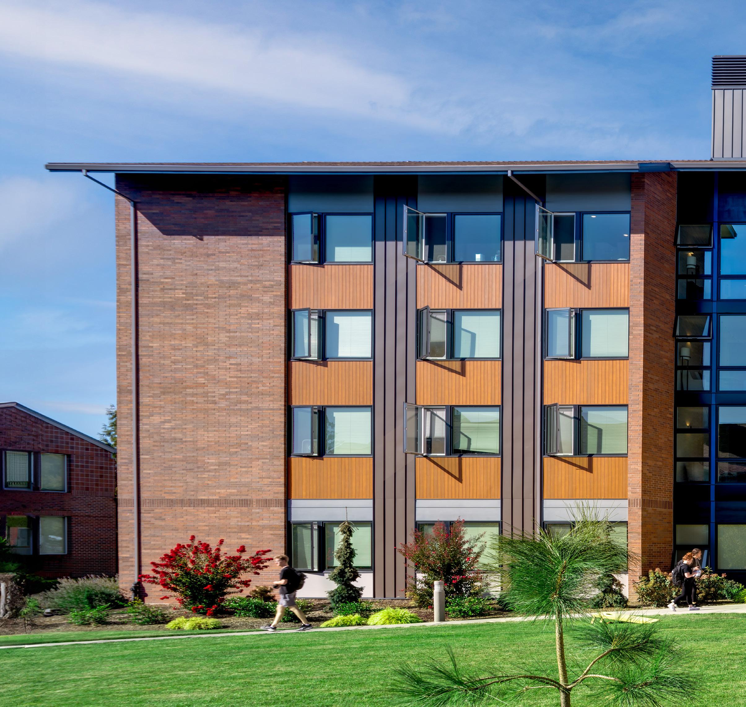 Description: As George Fox University’s largest residence hall, the new four-story building completes an existing residential quadrangle. The design-build project broke ground in the summer of 2018 and was completed in time to house students in the fall of 2019. Designed to entice upper classmen to stay on campus, the new residence hall includes 198 beds, student rooms, study lounges, washrooms, communal kitchen areas, seminar rooms and residence life offices.