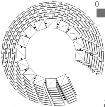 The two bowls below was created parametrically based on a grid structure, with tiered seating arrayed in bays, the left structural graphic is for a 30,000 seat stadium, and the right graphic represents a 20,000 seat stadia, with VIP seating indicated in purple and GA in yellow.