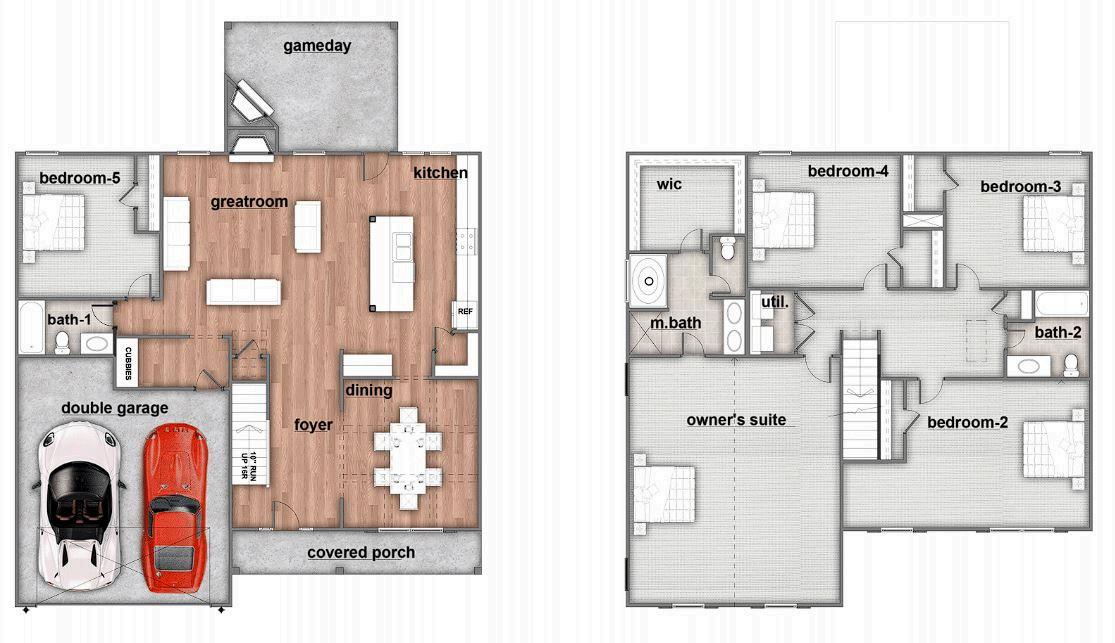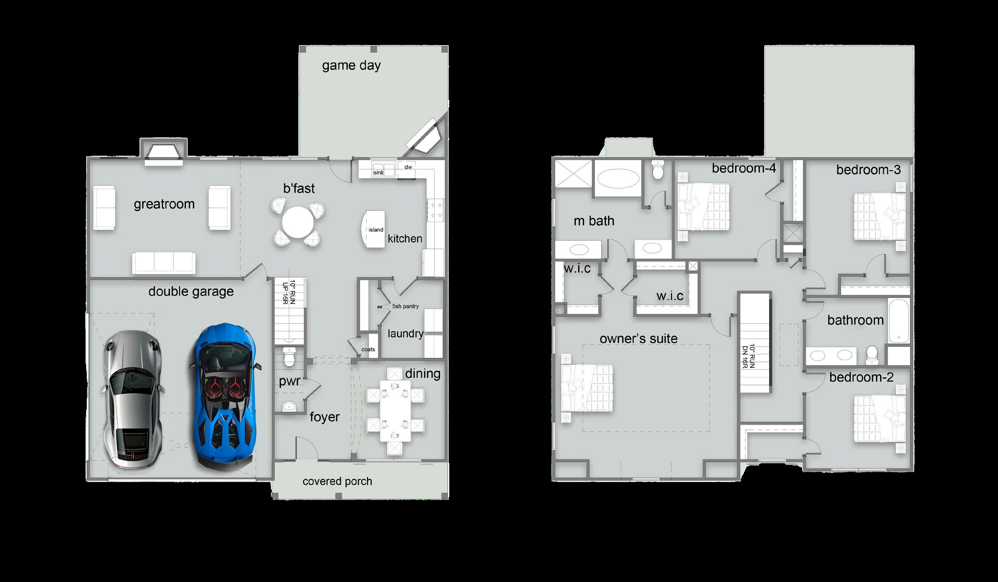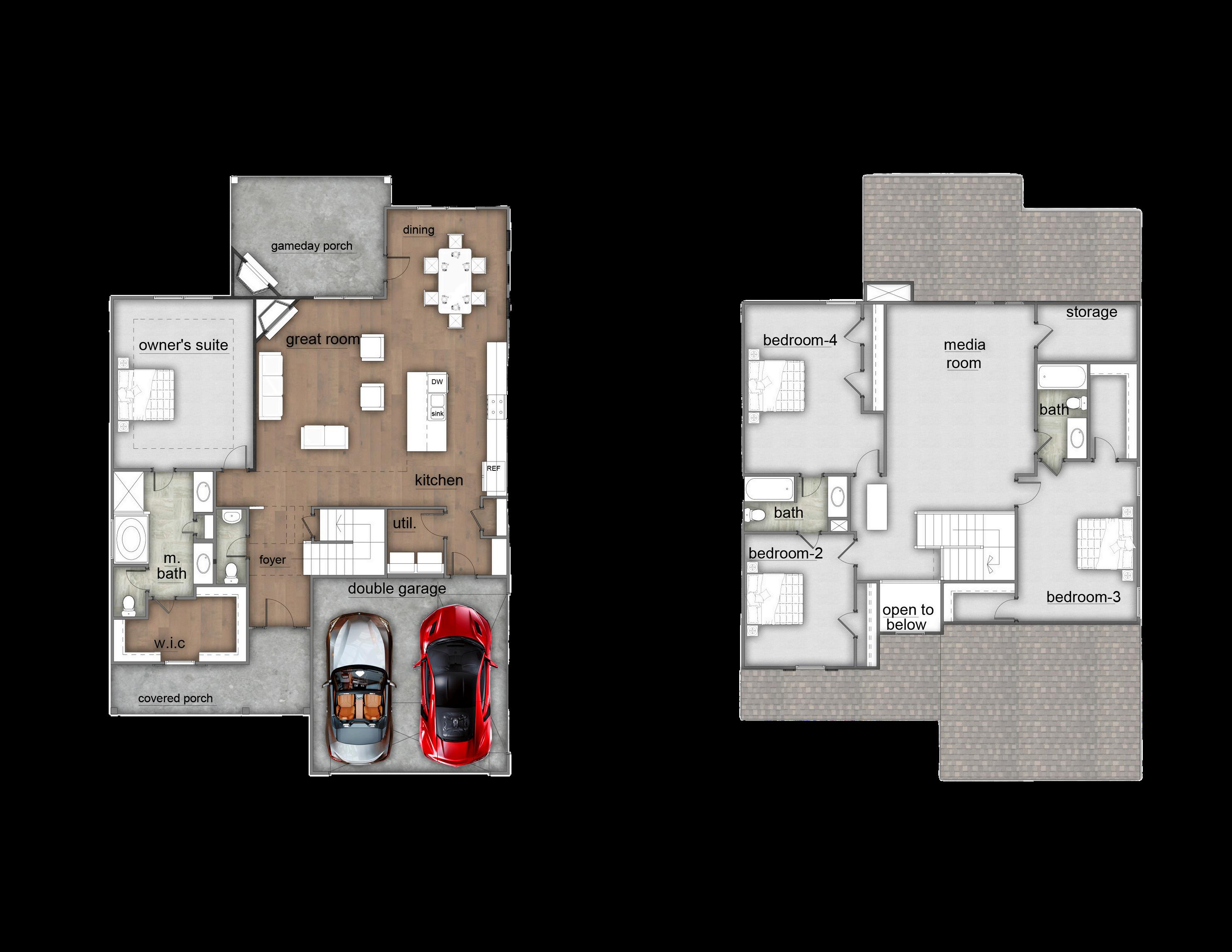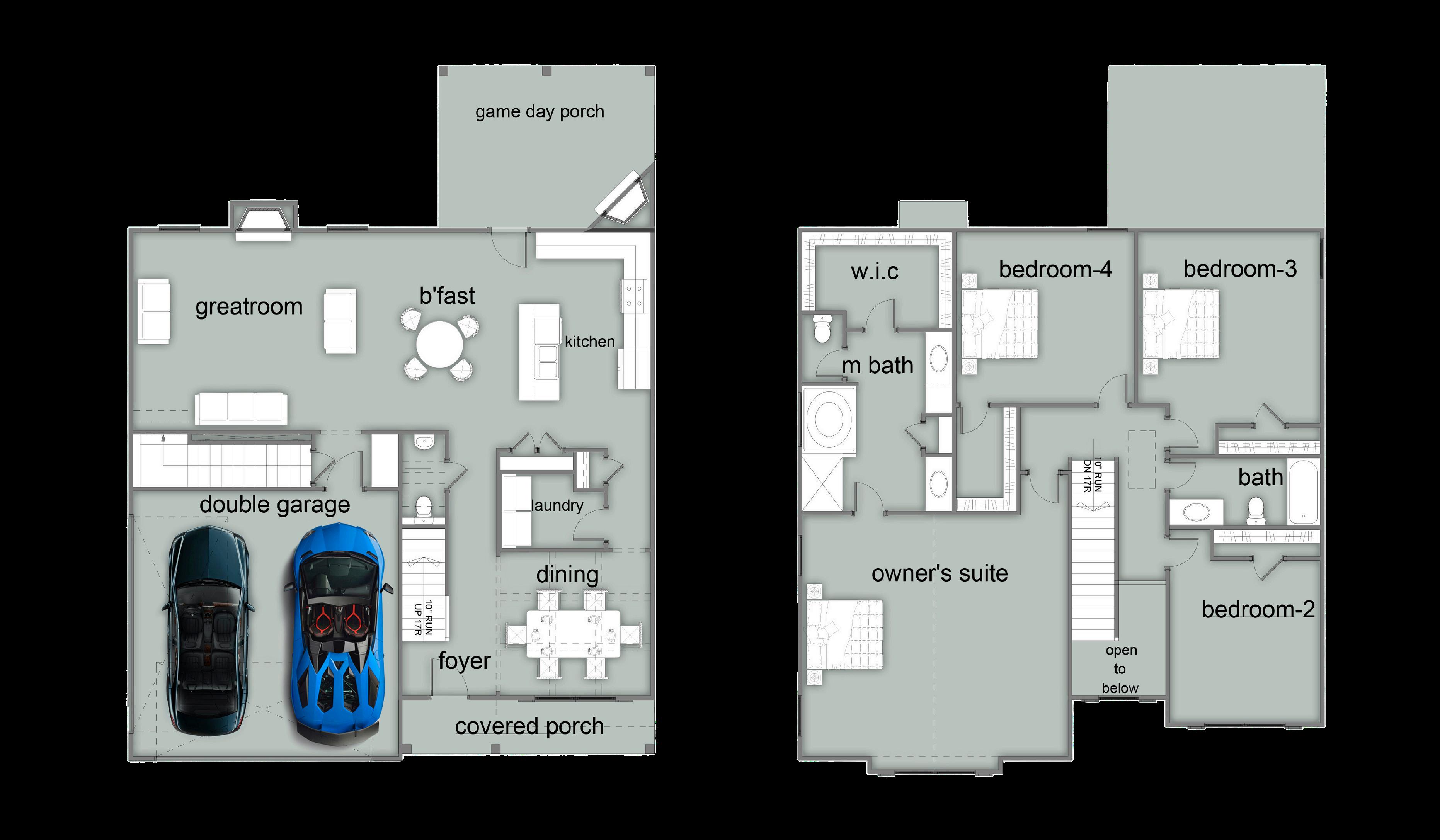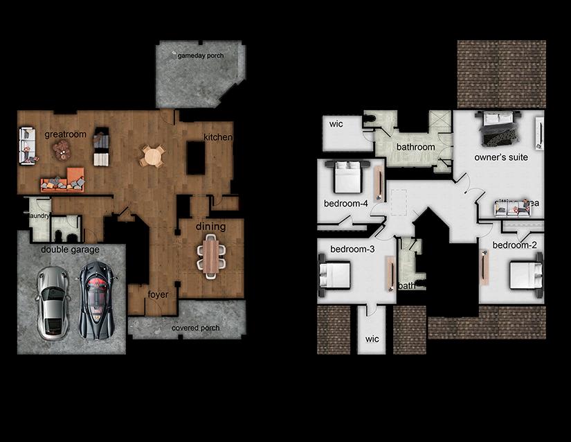 Exterior material placement is determined by community design. Front or Side Entry Garage and Game Day Porch determined per homesite/community. Please see included features page for community of interest, visit our onsite New Home Specialist, or contact our Online Sales Counselor for more specific design information.