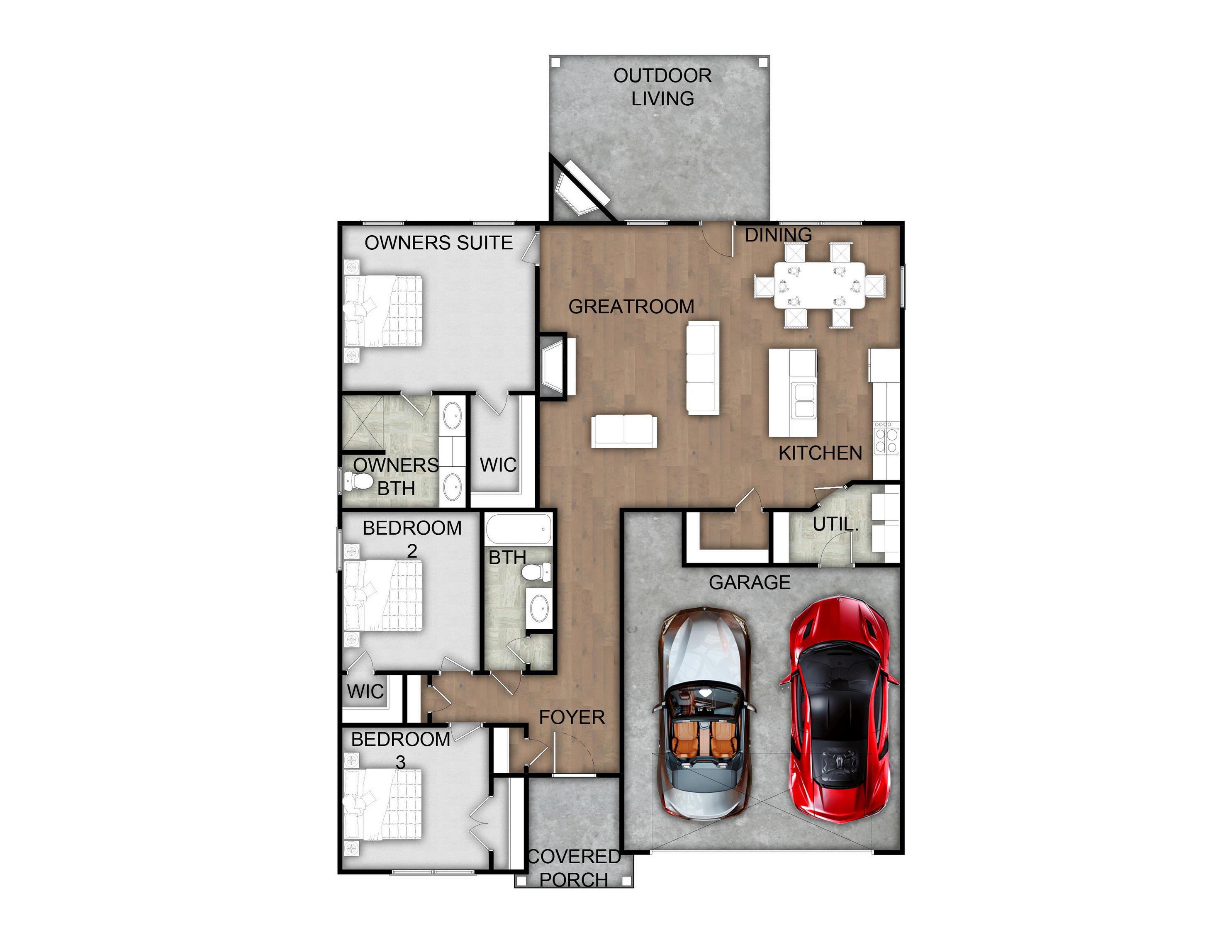 Exterior material placement is determined by community design. Front or Side Entry Garage and Game Day Porch determined per homesite/community. Please see included features page for community of interest, visit our on-site New Home Specialist, or contact our Online Sales Counselor for more specific design information.