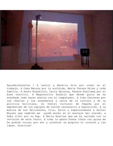 Agradecimientos > A Lastro y Materia Gris por creer en el trabajo. A Casa Matony por la acolhida, Maria Teresa Rojas y toda familia. A Santo Miguelito, Carla Spinoza, Renate Howllweg por el buen convivir. A Magnoscrito Rosário que desde Quito me ha enseñado como hacer música con el computador. A Iván Cárceres por las charlas y las enseñanzas a cerca de la cultura y de la política boliviana. Al Centro Cultural de España por el empréstimo de los equipos de sonido necessario a exposición. A la música de Los Delirantes, Cris, Kevin y especialmente a Xavier Moyano que también me ayudó mucho en el montaje del sonido, a Daba Jichi por su Rap. A Maria Buelvas que me ha salvado con la revisión de este texto. A toda la gente buena vibra con quien me he podido cruzar por ahí y calentar un poquito el corazón y las ideas. Gratitud!