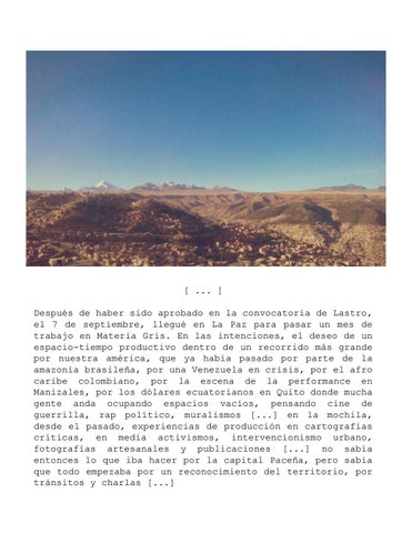 [ ... ] Después de haber sido aprobado en la convocatoria de Lastro, el 7 de septiembre, llegué en La Paz para pasar un mes de trabajo en Materia Gris. En las intenciones, el deseo de un espacio-tiempo productivo dentro de un recorrido más grande por nuestra américa, que ya había pasado por parte de la amazonía brasileña, por una Venezuela en crisis, por el afro caribe colombiano, por la escena de la performance en Manizales, por los dólares ecuatorianos en Quito donde mucha gente anda ocupando espacios vacíos, pensando cine de guerrilla, rap político, muralismos [...] en la mochila, desde el pasado, experiencias de producción en cartografías críticas, en media activismos, intervencionismo urbano, fotografías artesanales y publicaciones [...] no sabía entonces lo que iba hacer por la capital Paceña, pero sabía que todo empezaba por un reconocimiento del territorio, por tránsitos y charlas [...]