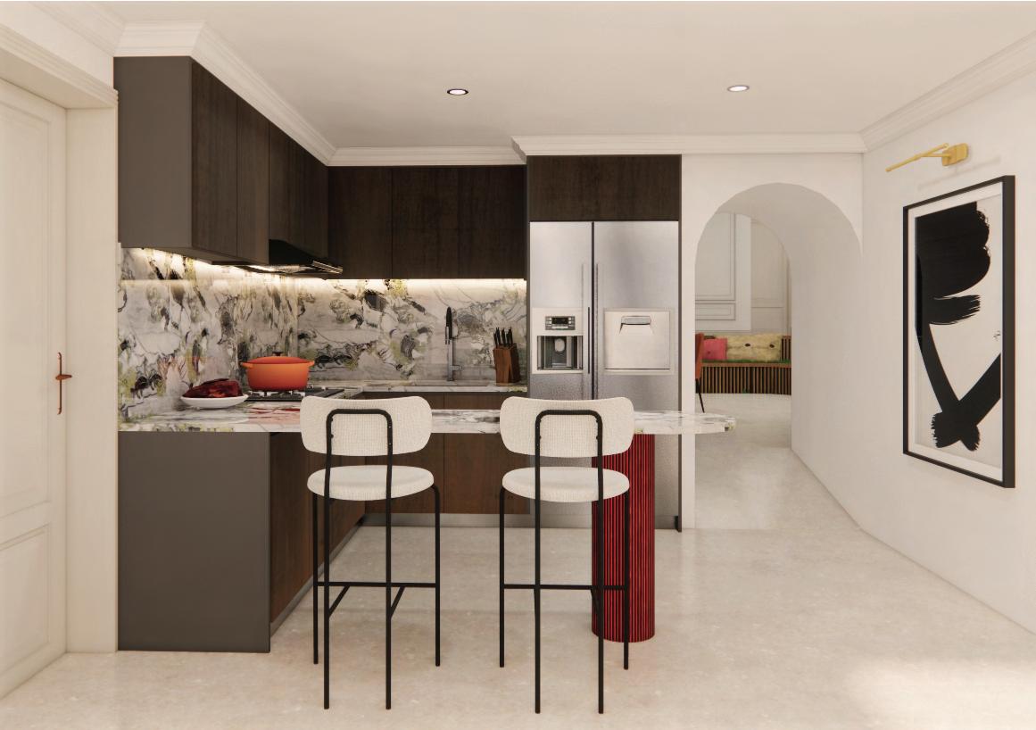 Meanwhile, the wet kitchen centers around a mini island that considers func�ons for heavy cooking, dining space for the maids, or even opportuni�es for bonding between the kids and the mother as its primary ac�vi�es.