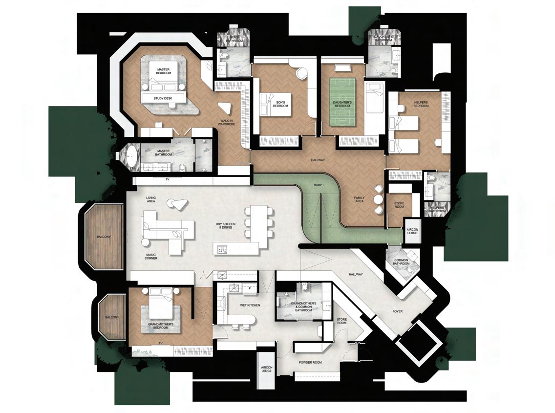 The previous dining room had been converted to the grandmother's room for ease of access. As a result, the dry kitchen & dining were combined to create a dining feature for the family. Addi�onally, the helper's room was moved above for convenience in taking care of the daughter.