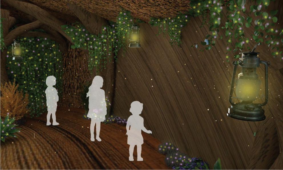 Aim to be a place of curiosity, empathy, and deep reflec�on. The team wanted a narra�ve that would feed kid's curious thirst for the unknown. Hence, the team created a thema�c area inspired by a magical hollow tree to promote kid's curiousity and crea�vity.