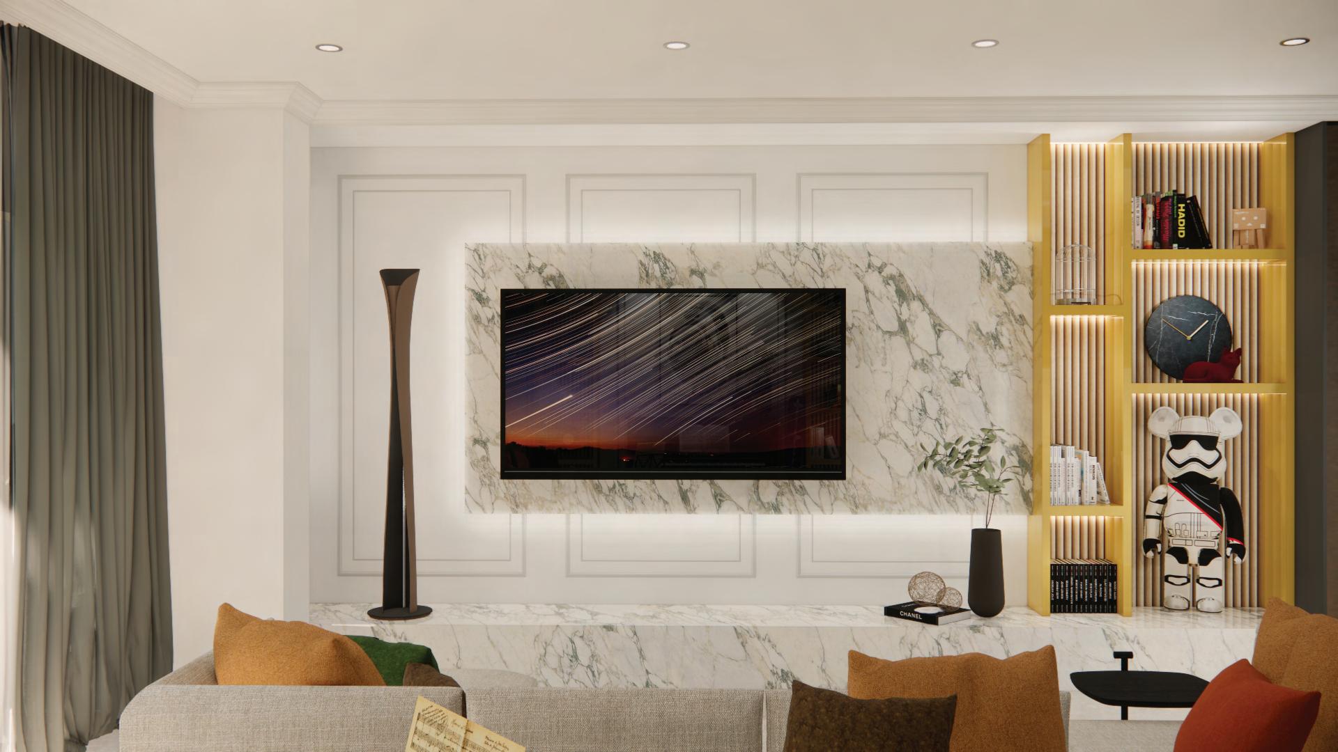 Purposely frame to be the center of a�en�on and area of bonding. So� Ligh�ng and a subtle marble finish help create a relaxing atmosphere. Addi�onally, the grandmother in wheelchair could join family bonding by the allocated empty space at the living area shown in the layout plan.