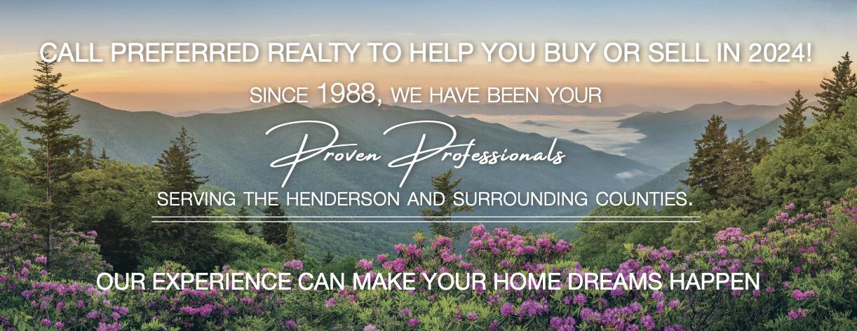 136 South King Street • Suite E Hendersonville, NC 28792 preferredrealtync.com Kathy Watkins 828-674-3517 • Debbi Merker 828-606-7601 • Katherine Fox 828-817-0755 • Bruce Benton 828-692-2332 • Amy Genao 386-490-3268 828.696.9900 Recently updated 3BR/2BA home convenient to Hendersonville! MLS#: 4122213 $399,900 211 Lyndon Ln, Hendersonville, NC 28792 Beautiful setting surrounds this mountain cottage!!! Open floor plan, and fantastic outdoor space!!! MLS#4141679 $495,000 65 Chickadee Hollow Ln, Hendersonville, NC 28792 Updates to home includes a new roof in 2021, new flooring in the main living area and a bathroom remodel. MLS#: 4137437 $370,000 89 Smoke Rise Hill Dr, Flat Rock, NC 28731 0 Low Gap Rd, Hendersonville, NC 28792 UNDERCONTRACTIN1DAY Your mountain getaway/ compound is here!!! Little Hungry River crossing from Little Hungry Rd, could access from that side with a bridge crossing. MLS#: 4136157 $599,900