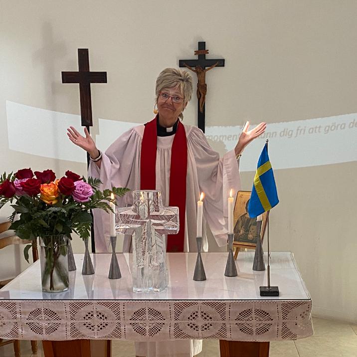 Här firar vi gudstjänster och svenska traditioner. Många hittar hit för att tända ett ljus eller sitta ner i kyrksalen för en stunds stillhet. På midsommar binder vi kransar och dansar runt midsommarpalmen.