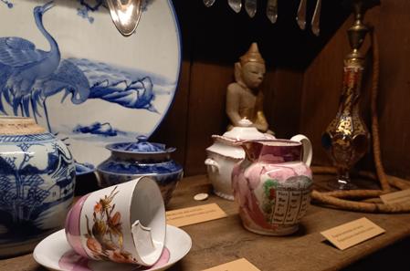 Jakobstad var under 1700och 1800-talet en utpräglad sjöfartsstad och med fartygen kom nyheter till Jakobstad. Här finns bland annat en mustaschkopp för herrar med stora mustascher. Kanten på insidan hindrar mustaschen från att falla ner i koppen. I bakgrunden syns en vattenpipa eller nargileh.