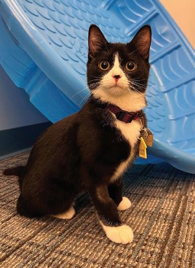with a badly injured leg was found and taken to our shelter by a good Samaritan. She weighed less than 3 pounds and needed immediate medical attention. HSMO’s veterinary team determined her left hind leg was so damaged it would need to be amputated for her to lead a normal, pain-free life, and they immediately performed the operation. The tiny tuxedo kitten made it through surgery and was soon on the road to recovery. Our staff named her Butters.