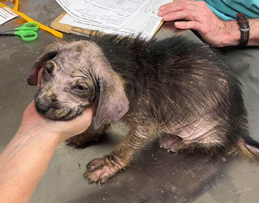 Just two days later, 13 dogs were rescued from unconscionable neglect. All had sarcoptic mange, a highly contagious disease caused by mites burrowing through the dogs’ skin resulting in unrelenting itching, infection, and hair loss. These dogs were suffering horribly.