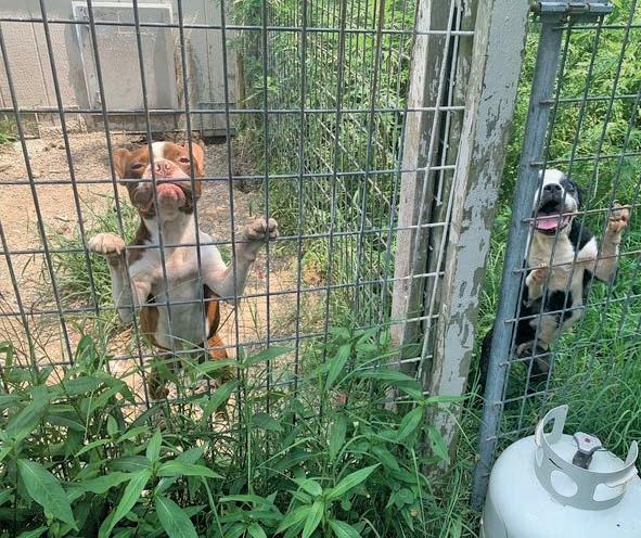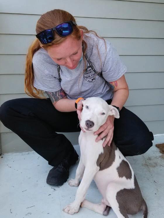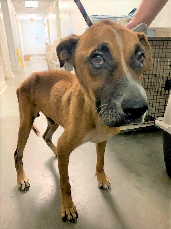 that ran loose on the property and freed others held in kennels overgrown with weeds. The dogs were infested with ticks and fleas, and their fur was matted and covered in filth. For one dog, the rescue efforts were hours too late; the team found remains of other deceased dogs on the grounds and in the kennels in various stages of decomposition. Inside the home, a three-year-old boxer, both hind legs wrapped in bandages, was carried to the rescue van.