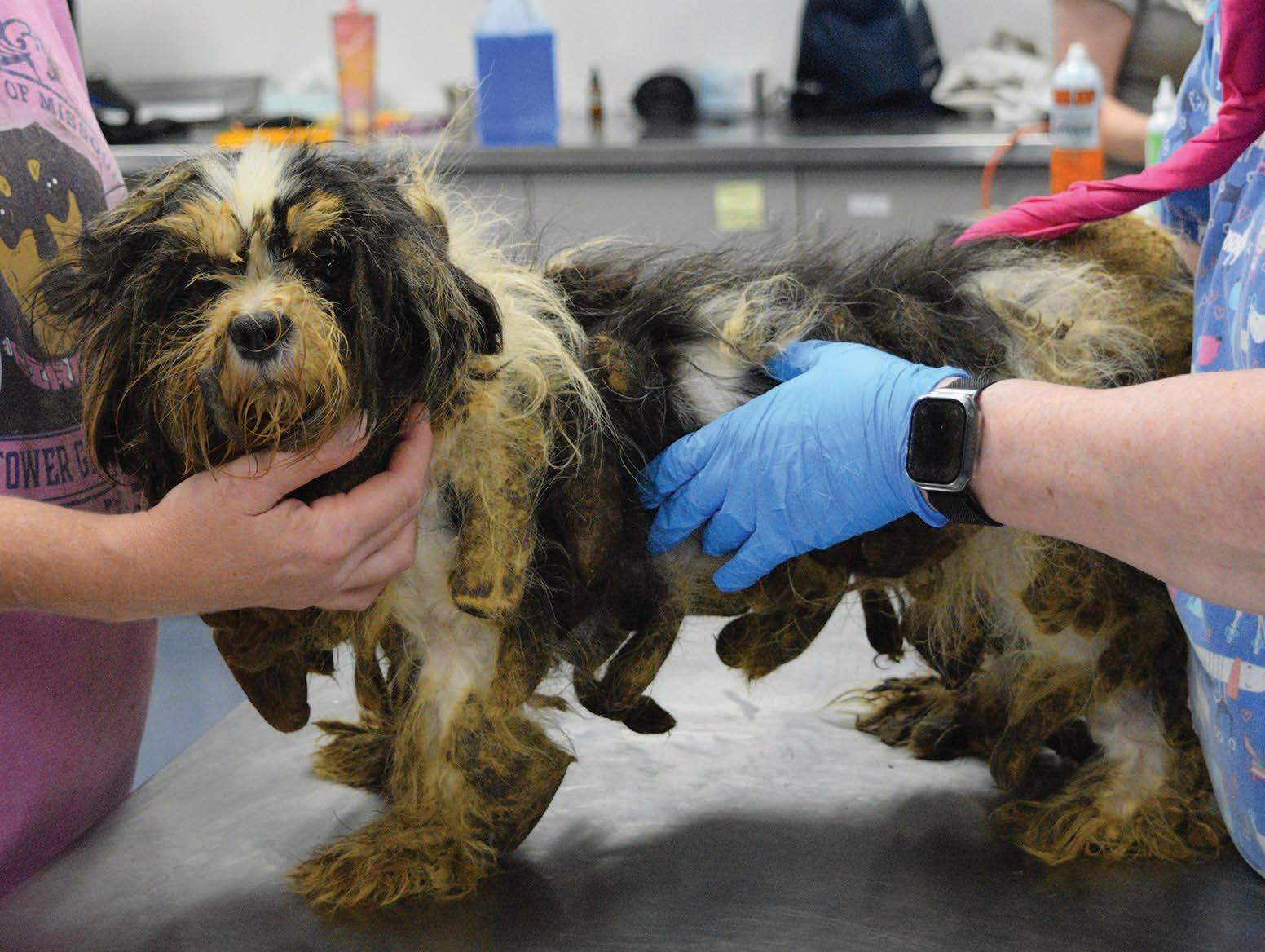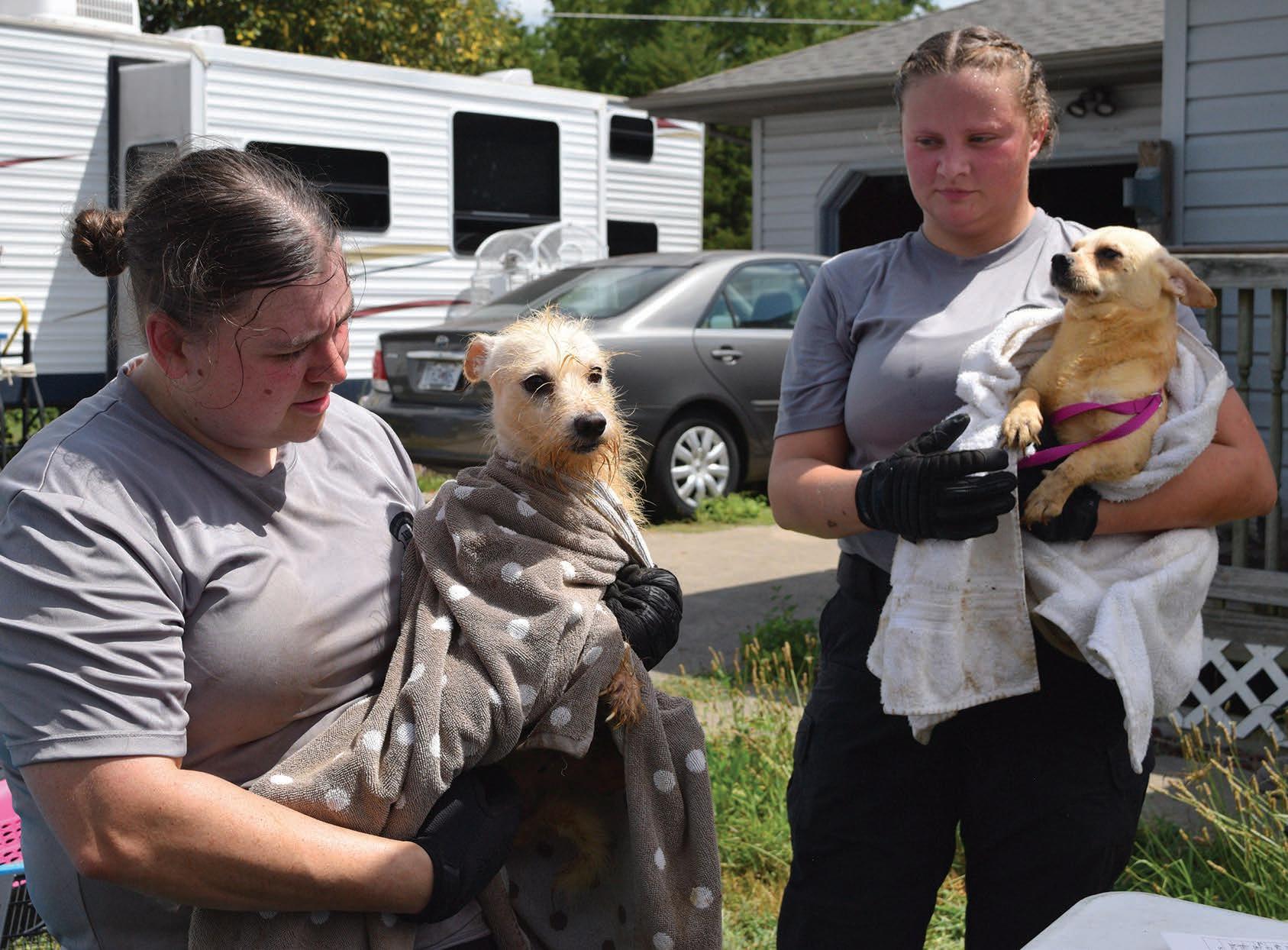 From the outside, the small ranch house looked tidy. The lawn was mowed, flowers planted, a little garden near the front. Inside told a far different story. The house was horrifically damaged: holes in the walls, squishy floors soaked through with filth, and feces covering the rooms. The air was stifling as temperatures climbed well into the 90s. Dogs were perched on counters and shelves, with barely an inch of floor space to move. None of the animals had received veterinary care.