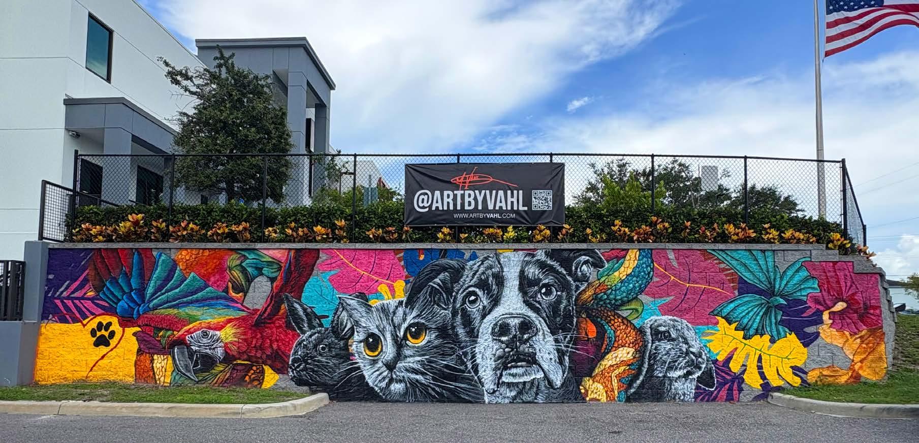 Local artist Michael Vahl of ArtbyVahl worked with HSTB to bring vibrant color and creativity to the shelter! Michael designed and painted a stunning mural outside the Intake Department, celebrating the joy and hope every pet deserves. The painting process took place during the summer which allowed some Career Camp participants to learn about using art to make a difference and even to help with the painting!