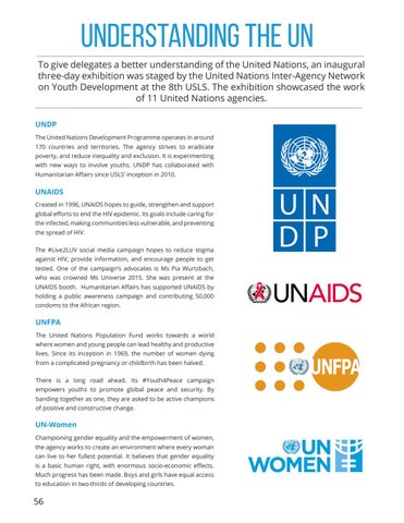 UNDERSTANDING THE UN To give delegates a better understanding of the United Nations, an inaugural three-day exhibition was staged by the United Nations Inter-Agency Network on Youth Development at the 8th USLS. The exhibition showcased the work of 11 United Nations agencies. UNDP The United Nations Development Programme operates in around 170 countries and territories. The agency strives to eradicate poverty, and reduce inequality and exclusion. It is experimenting with new ways to involve youths. UNDP has collaborated with Humanitarian Affairs since USLS’ inception in 2010.