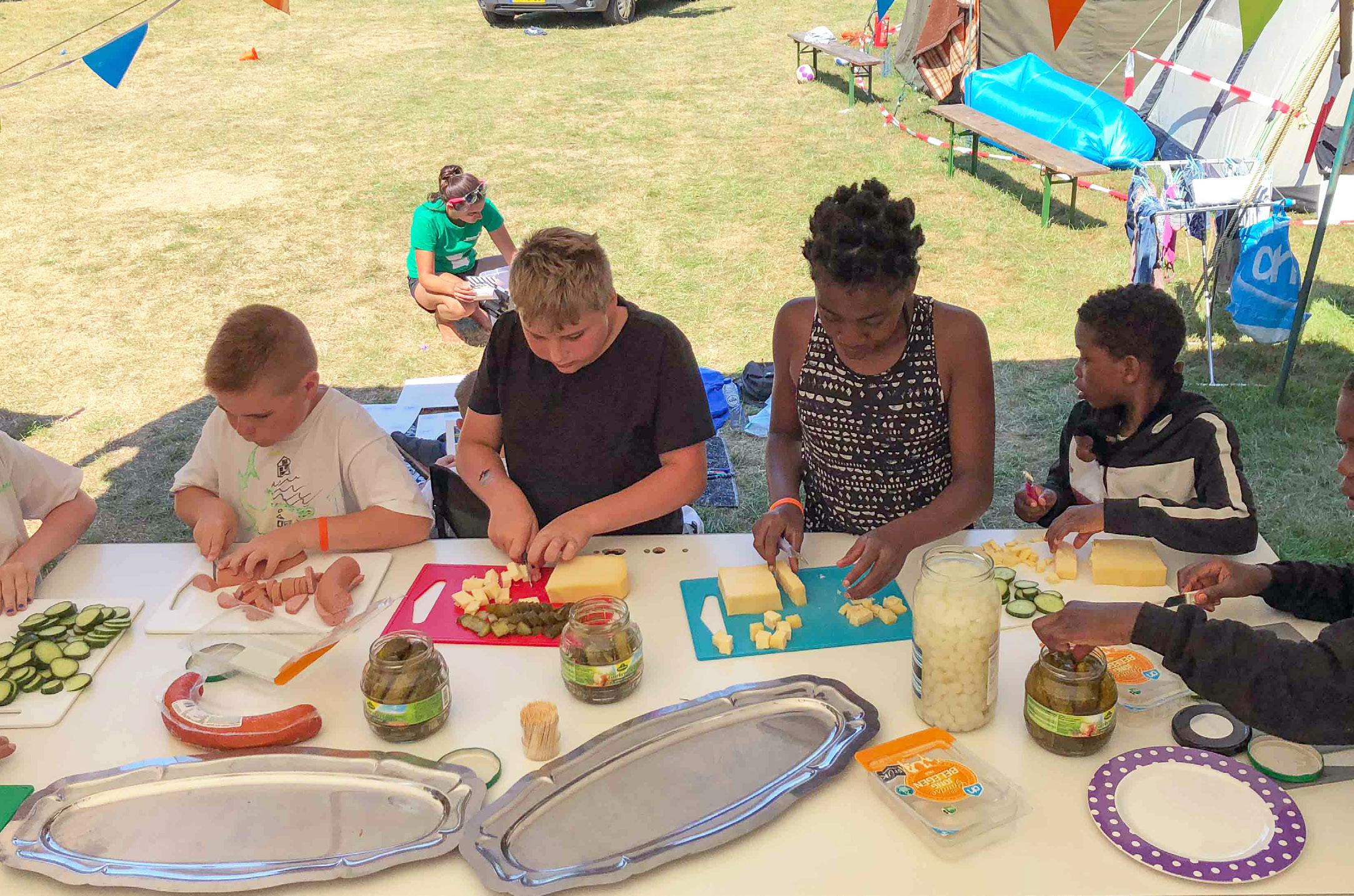 derwijsachtergrond. Broekman: “Maar zodra een zorgprofessional een label op een kind plakt en het woord ‘behandelplan’ valt, wordt hij vanzelf gecorrigeerd door collega’s. ‘Zeg, het is hier wel vakantie hè.’” De vrijwilligers hebben niet alle informatie over de kinderen. Ze weten alleen het hoogstnoodzakelijke, zodat ze onbevooroordeeld met hen omgaan. Met drie groepen tegelijkertijd, een technische dienst voor de logistiek en een grote kooktent in het midden is alles efficiënt georganiseerd.