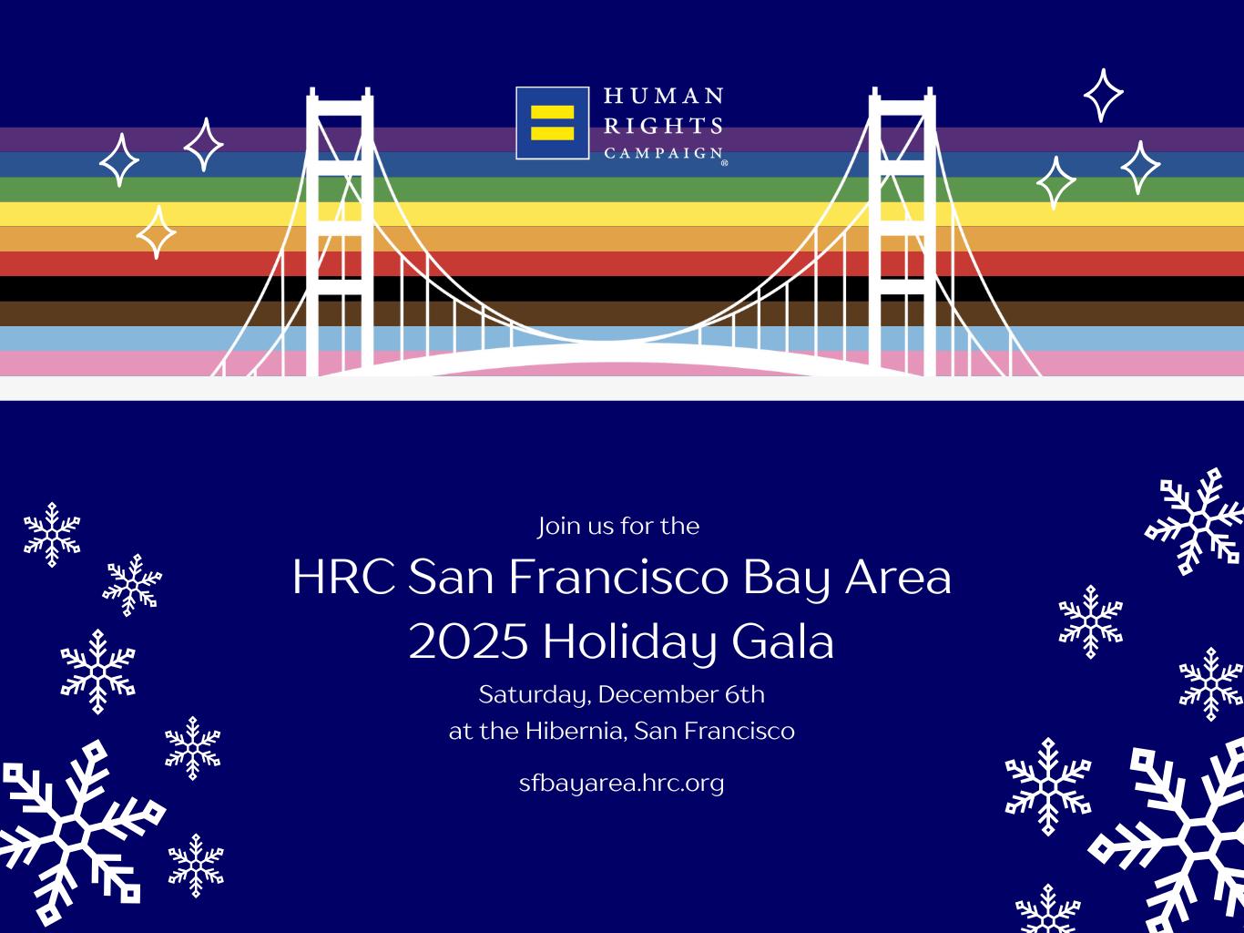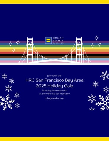 On behalf of the Human Rights Campaign, we are delighted to welcome you to the 2025 San Francisco Bay Area Dinner! It is truly an honor to have you here with us tonight as we come together in support of equality, inclusion, and justice for the LGBTQ+ community. Whether you are a long-time advocate or joining us for the first time, your presence and dedication are helping drive meaningful change in our communities, our country, and beyond.