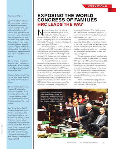 “propaganda” legislation. After the bill became law, LGBT Russians have been subjected to horrific incidents of discrimination, harassment, public beatings and more. Exposed also documents WCF officials’ regular travel to, and forceful advocacy in, Africa — which has corresponded with a disturbing rise in harsh penalties for LGBT Africans. WCF officials have also been active for years in Australia and have helped stymie attempts to enact marriage equality there. Already, Australian activists have been able to use HRC’s report to call attention to a planned WCF gathering in Melbourne. Using Exposed, the Australians put pressure on government officials to drop their participation in the event and on event venues to cancel space for the group. The WCF received so much negative attention in Australia that they issued an “Open Letter” smearing LGBT and pro-choice activists as “sexual radicals.” “We’re committed to tracking and combatting this hate group wherever they go,” said HRC President Chad Griffin.