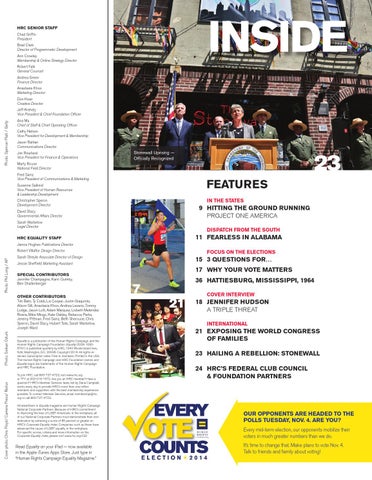 Equality is a publication of the Human Rights Campaign and the Human Rights Campaign Foundation. Equality (ISSN 10925791) is published quarterly by HRC, 1640 Rhode Island Ave., N.W., Washington, D.C. 20036. Copyright 2014. All rights reserved. Subscription rates: Free to members. Printed in the USA. The Human Rights Campaign and HRC Foundation names and Equality logos are trademarks of the Human Rights Campaign and HRC Foundation. To join HRC, call 800-727-4723, visit www.hrc.org or TTY at 202-216-1572. Are you an HRC member? Have a question? HRC’s Member Services team, led by Dana Campbell, works every day to provide HRC’s more than one million members and supporters with the best membership experience possible. To contact Member Services, email membership@hrc. org or call 800-727-4723. All advertisers in Equality magazine are Human Rights Campaign National Corporate Partners. Because of HRC’s commitment to improving the lives of LGBT Americans in the workplace, all of our National Corporate Partners must demonstrate their own dedication by achieving a score of 85 percent or greater on HRC’s Corporate Equality Index. Companies such as these have advanced the cause of LGBT equality in the workplace. For specific scores, criteria and more information on the Corporate Equality Index, please visit www.hrc.org/CEI.