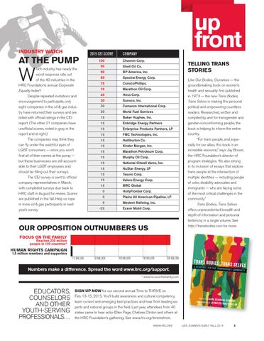 hich industry has nearly the worst response rate out of the 40 industries in the HRC Foundation’s annual Corporate Equality Index? Despite repeated invitations and encouragement to participate, only eight companies in the oil & gas industry have returned their surveys and are listed with official ratings in the CEI report. (The other 21 companies have unofficial scores, noted in gray in the report and at right.) The companies may think they can fly under the watchful eyes of LGBT consumers — since you won’t find all of their names at the pump — but these businesses are still accountable to their LGBT employees and should be filling out their surveys. The CEI survey is sent to official company representatives in March, with completed surveys due back to HRC staff in August for review. Scores are published in the fall. Help us rope in more oil & gas participants in next year’s survey.