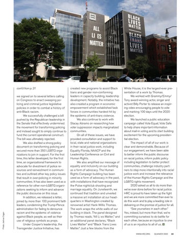 White House, it is the largest-ever presentation of a work by Thomas. We worked with Grammy/Emmy/ Tony award-winning actor, singer and activist Billy Porter to release an inspiring video encouraging people to vote and marking 100 days until the 2020 election. We launched a public education campaign called Vote Equal, Vote Safe to help share important information about mail-in voting and to start building excitement for the upcoming presidential election. The impact of all of our work is clear and demonstrable. Because of our engagement, we have been able to better inform the public discourse on racial justice, inform public policy including legislation to better protect communities, challenge industry partners to step more intentionally into racial justice work and increase the relevance of the Human Rights Campaign and the LGBTQ rights movement. 2020 asked us all to do more than we’ve ever done before for racial justice. HRC is proud to have taken up the fight and we are more committed than ever to do this work and to play a leading role in delivering on the promise of justice for all. “See yourselves in each other.” Yes, indeed, but more than that, we’re committing ourselves to do battle for each other, because an injustice to one of us is an injustice to all of us. WWW.HRC.ORG