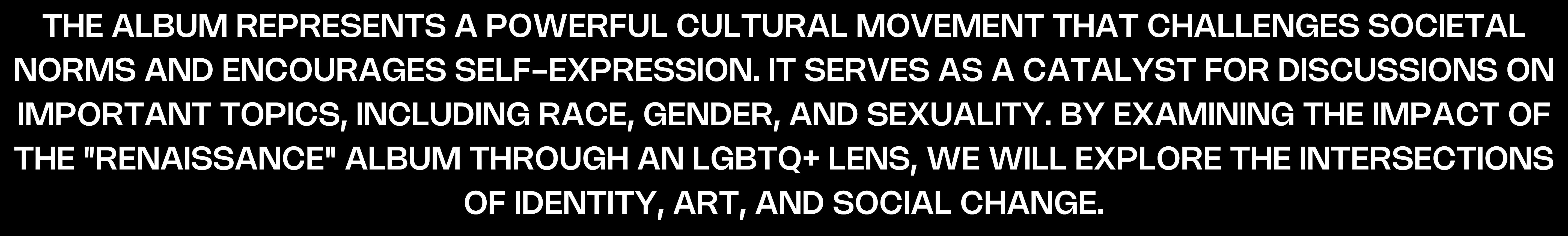 THE QUEER RENAISSANCE SYLLABUS DRAWS INSPIRATION FROM BEYONCÉ'S RENOWNED ALBUM, RENAISSANCE, AND THE INCLUSIVE ESSENCE OF THE LGBTQ+ COMMUNITY. JUST AS BEYONCÉ'S MUSIC CELEBRATES DIVERSE VOICES, THIS RESOURCE AIMS TO DELVE INTO THE RICH SPECTRUM OF LGBTQ+ EXPERIENCES AND EXPRESSIONS.