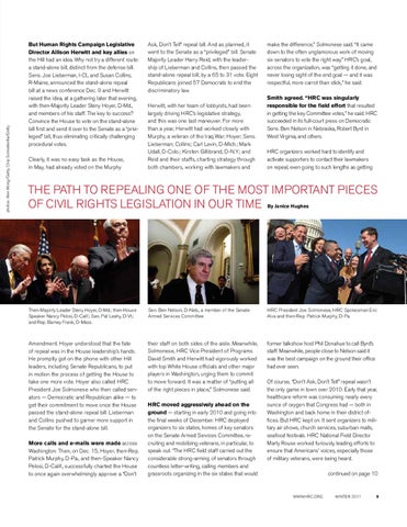 Ask, Don’t Tell” repeal bill. And as planned, it went to the Senate as a “privileged” bill. Senate Majority Leader Harry Reid, with the leadership of Lieberman and Collins, then passed the stand-alone repeal bill, by a 65 to 31 vote. Eight Republicans joined 57 Democrats to end the discriminatory law. Herwitt, with her team of lobbyists, had been largely driving HRC’s legislative strategy, and this was one last maneuver. For more than a year, Herwitt had worked closely with Murphy, a veteran of the Iraq War; Hoyer; Sens. Lieberman; Collins; Carl Levin, D-Mich.; Mark Udall, D-Colo.; Kirsten Gillibrand, D-N.Y.; and Reid and their staffs, charting strategy through both chambers, working with lawmakers and