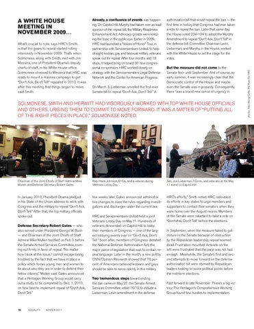 Whatâs crucial to note, says HRCâs Smith, is that the gears to repeal started rolling intensively in November 2009. Thatâs when Solmonese, along with Smith, met with Jim Messina, one of President Obamaâs deputy chiefs of staff, in his White House office. Solmonese stressed to Messina that HRC was ready to mount a massive campaign to get âDonât Ask, Donât Tellâ repealed in 2010. It was after this meeting that things began to move, said Smith.