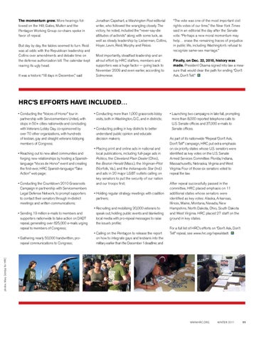 ⢠Launching two campaigns in late fall, prompting more than 8,000 reported telephone calls to U.S. Senate offices and 37,000 e-mails to Senate offices. As part of its nationwide âRepeal âDonât Ask, Donât Tellââ campaign, HRC put extra emphasis on six priority states whose U.S. senators were identified as key votes on the U.S. Senate Armed Services Committee: Florida, Indiana, Massachusetts, Nebraska, Virginia and West Virginia. Four of those six senators voted to repeal the law. After repeal successfully passed in the committee, HRC placed emphasis on 11 additional states whose senators were identified as key votes: Alaska, Arkansas, Illinois, Maine, Montana, Nevada, New Hampshire, North Dakota, Ohio, South Dakota and West Virginia. HRC placed 27 staff on the ground in key states. For a full list of HRCâs efforts on âDonât Ask, Donât Tellâ repeal, see www.hrc.org/repealdadt.
