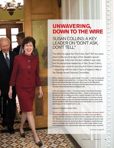 Collins’ leading role was no surprise, though. The senator — known for being able to deftly negotiate across party lines — is a staunch ally. Years ago, she opposed the anti-gay Federal Marriage Amendment. She is also the lead Republican sponsor of two important bills, the Employment Non-Discrimination Act and the Domestic Partnership Benefits and Obligations Act. In the new Congress, Collins — the ranking member of the Senate Homeland Security and Governmental Affairs Committee — intends to work closely with its chairman, Sen. Joe Lieberman, I-Conn., another champion in the “Don’t Ask, Don’t Tell” battle, on key LGBT issues, she told Equality in an interview recently. That includes working to move the domestic partnership measure, which would provide benefits to LGBT federal employees and their families, out of committee and bringing it to the Senate floor for a vote. Excerpts of Equality’s interview follow. Senator, what moment for you stands out the most about the repeal effort? As a member of the Senate Armed Services Committee, I was committed to passing a Defense Authorization bill that included a repeal of “Don’t Ask, Don’t Tell.” Senator Joe Lieberman and I felt we were making progress toward a deal with the majority leader that would have allowed Republican amendments and paved a successful path toward the 60 votes needed to begin debate. It was very frustrating when the majority leader scheduled a vote knowing it would fail. continued on page 29
