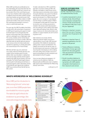 To better understand how HRC could fill this gap, Kahn convened a meeting at HRC with educators and leaders in safe-schools work to share ideas about an elementary-school solution. Among the attendees was a parent from Boston who had been working with a group of other parents and educators on a “Welcoming Schools” guide, still a work in progress. It was designed to do two things: to meet the needs of children in kindergarten to fifth grade (K–5) whose family structures were not being represented or included in the schools, and to help educators who were asking for tools to address bias-based name-calling and bullying. It also offered a wide range of resources for school administrators and educators to support students who don’t conform to gender norms. Kahn started to work closely with the “Welcoming Schools” leaders and set up a national advisory council. Later, HRC assumed stewardship of the initiative for development, piloting, further research and distribution. The initiative, fine-tuned over the last few years, offers tools, lessons and resources on family diversity and gender stereotyping as well as bullying and name-calling. It also provides resources to parents and guardians as well as educators and administrators for the K–5 grades. It has now been piloted and evaluated in 12 schools across five districts in California, Massachusetts and Minnesota. Upon completion, Kahn and her team will distribute the “Welcoming Schools” tools further. continued on p. 31