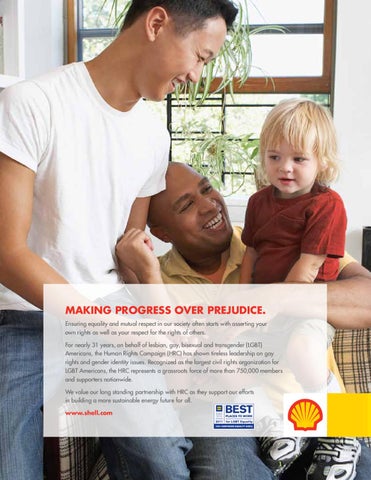 MAKING PROGRESS OVER PREJUDICE. Ensuring equality and mutual respect in our society often starts with asserting your own rights as well as your respect for the rights of others. For nearly 31 years, on behalf of lesbian, gay, bisexual and transgender (LGBT) Americans, the Human Rights Campaign (HRC) has shown tireless leadership on gay rights and gender identity issues. Recognized as the largest civil rights organization for LGBT Americans, the HRC represents a grassroots force of more than 750,000 members and supporters nationwide. We value our long standing partnership with HRC as they support our efforts in building a more sustainable energy future for all. www.shell.com