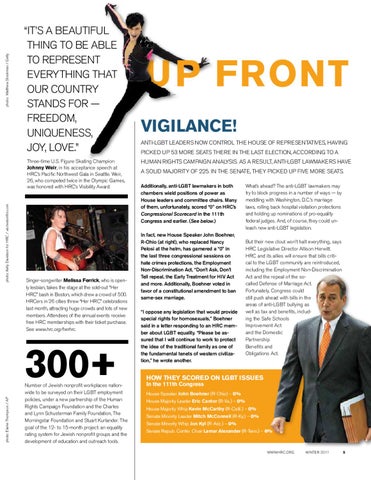 What’s ahead? The anti-LGBT lawmakers may try to block progress in a number of ways — by meddling with Washington, D.C.’s marriage laws, rolling back hospital visitation protections and holding up nominations of pro-equality federal judges. And, of course, they could unleash new anti-LGBT legislation. But their new clout won’t halt everything, says HRC Legislative Director Allison Herwitt. HRC and its allies will ensure that bills critical to the LGBT community are reintroduced, including the Employment Non-Discrimination Act and the repeal of the socalled Defense of Marriage Act. Fortunately, Congress could still push ahead with bills in the areas of anti-LGBT bullying as well as tax and benefits, including the Safe Schools Improvement Act and the Domestic Partnership Benefits and Obligations Act.